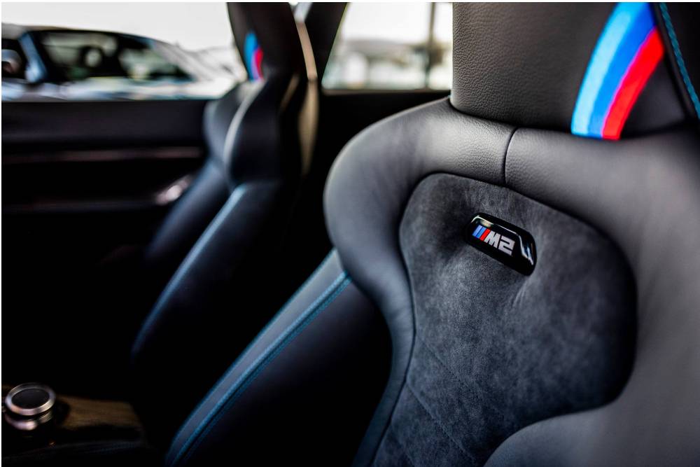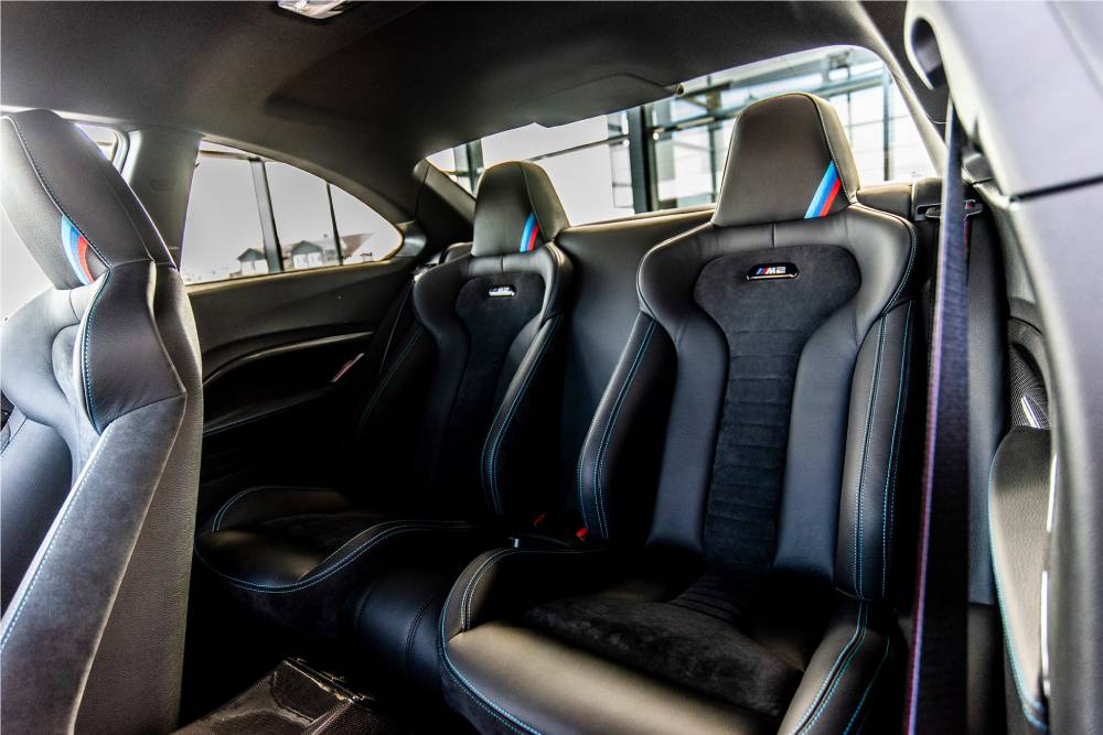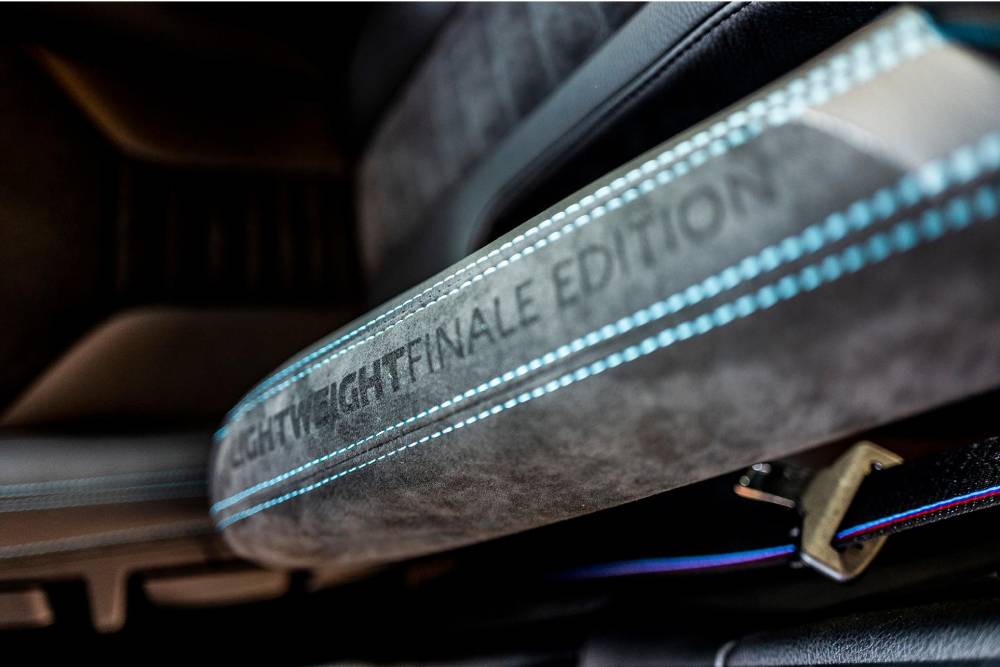 Από την κορυφαία M5 είναι εμπνευσμένη η διάταξη του πίσω καθίσματος, με τα δυο ανεξάρτητα μπάκετ. Τα ανθρακονήματα, οι δερμάτινες-suede επενδύσεις και το βουρτσισμένο αλουμίνιο σε γαλάζιο χρώμα, εννοείται πως κυριαρχούν στο εσωτερικό.