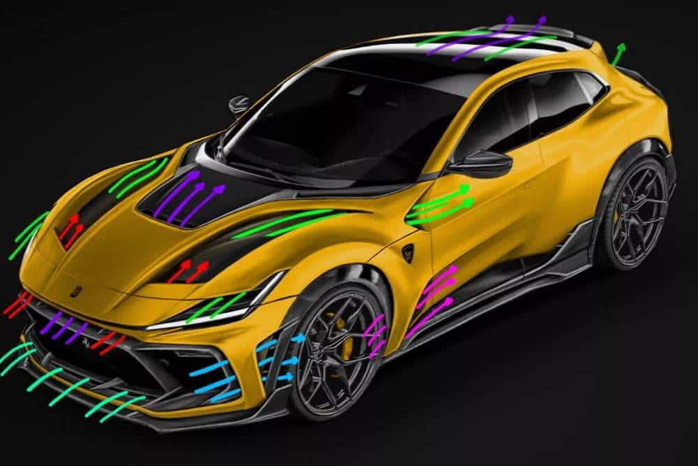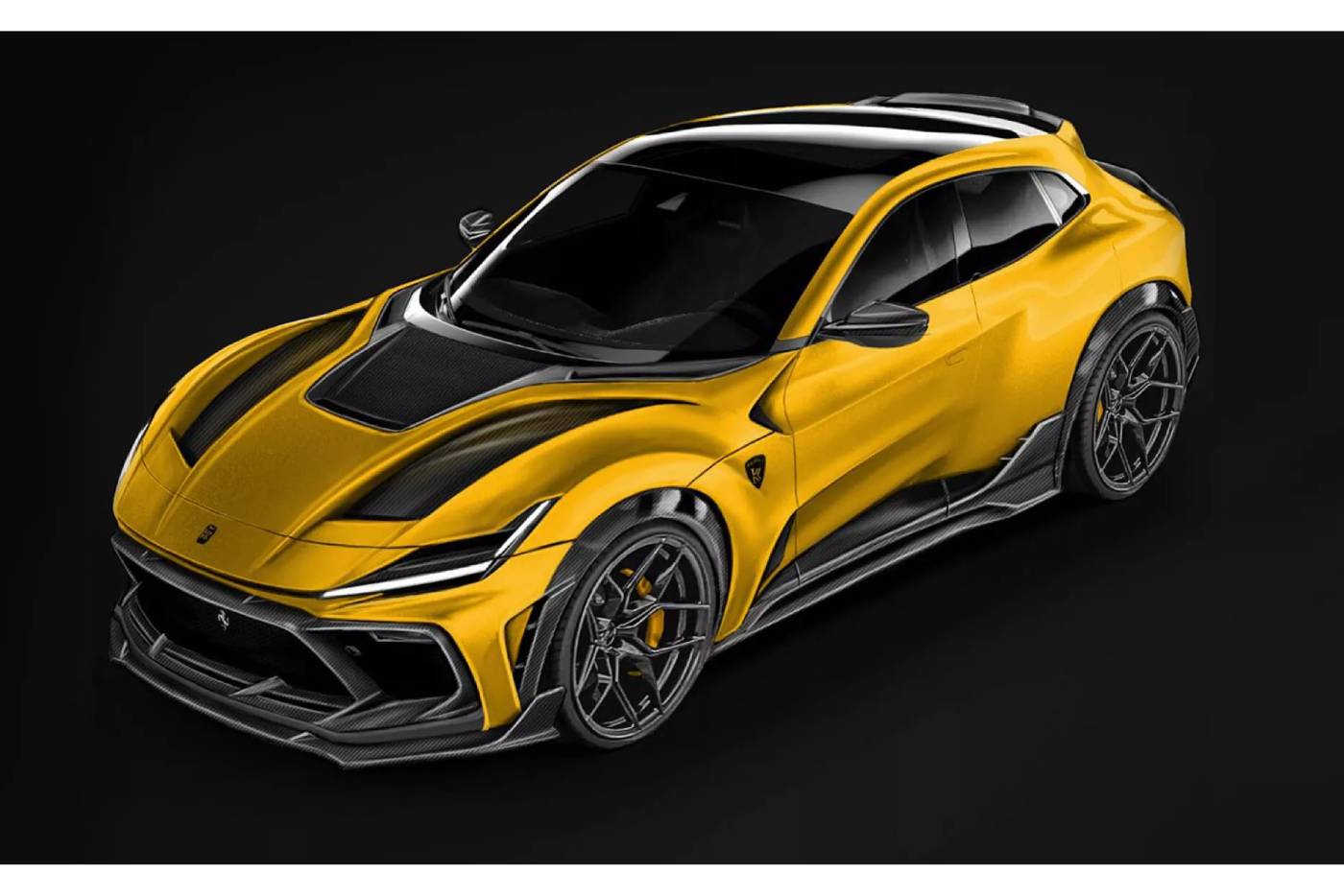 Η βελτιωμένη Purosangue είναι ακόμα rendering, αλλά οι διαθέσεις της ξεκάθαρες. Το ακραίο bodykit αποτελεί προϊόν 3D εκτύπωσης και ανθρακονημάτινης προέλευσης, έχοντας εξελιχθεί σε ειδικά υπολογιστικά προγράμματα με γνώμονα την αύξηση της κάθετης δύναμης, αλλά και την απομάκρυνση των θερμών αέριων μαζών από το μηχανοστάσιο (κυρίως) και τα φρένα. Η εμφάνιση της SUV Ferrari έρχεται όσο πιο κοντά γίνεται σε εκείνη αγωνιστικών κατασκευών, φτάνοντας σε σημείο να θυμίζει περισσότερο mega hatch παρά crossover ελέω του έντονου χαμηλώματος στην ανάρτηση. Οι 22άρες ζάντες γεμίζουν ασφυκτικά τους θόλους, κρύβοντας από πίσω τους 8πίστονες δαγκάνες εμπρός και 6πίστονες πίσω.