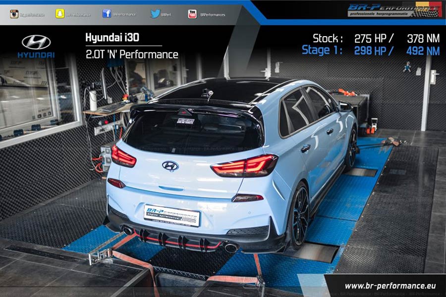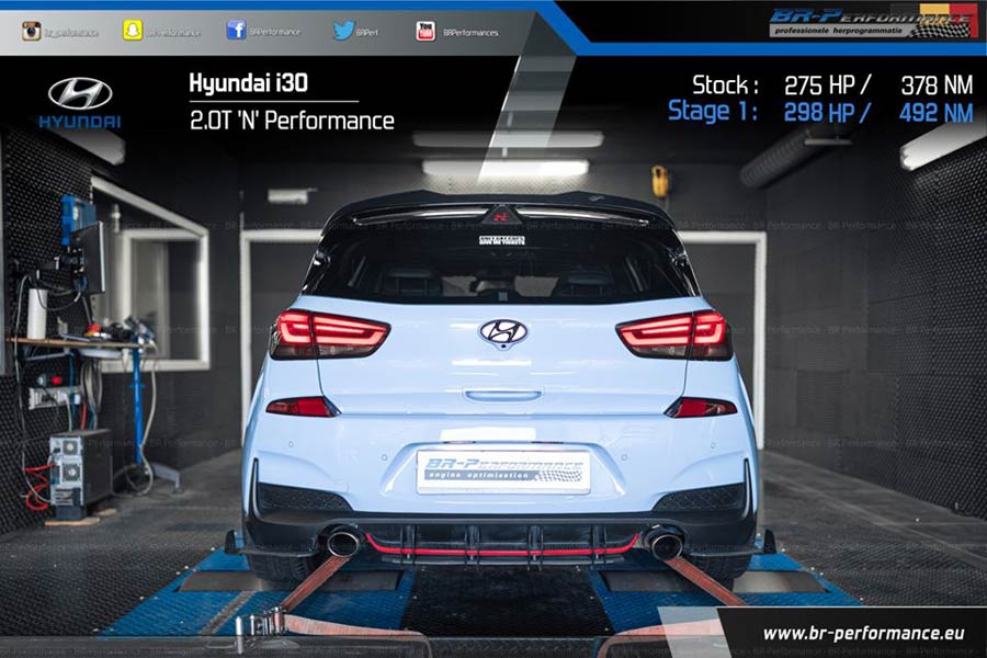 Λίγη ακόμα περισσότερη ισχύς είναι σίγουρα ευπρόσδεκτη και αυτό το αναλαμβάνουν βελτιωτές. Όπως είναι η BR-Performance που φτάνει την απόδοση στα 300 άλογα παρά κάτι. Συγκεκριμένα, με την αναβάθμιση της ηλεκτρονικής μονάδας ελέγχου, ο 2.0 T-GDI φτάνει τους 298 ίππους και τα 491 Nm ροπής, έναντι 259 ίππους και 386 Nm ροπής που έφτασε στο δυναμόμετρο. Άλλωστε και σε άλλη δυναμομέτρηση, έχουμε δει το i30 N Performance να έχει λιγότερους ίππους από τους 275 που ανακοινώνει η Hyundai (256 hp και 398 Nm). Οπότε, ουσιαστικά η BR-Performance αυξάνει την ισχύ κατά 39 ίππους και 105 Nm μέσω του νέου προγράμματος.