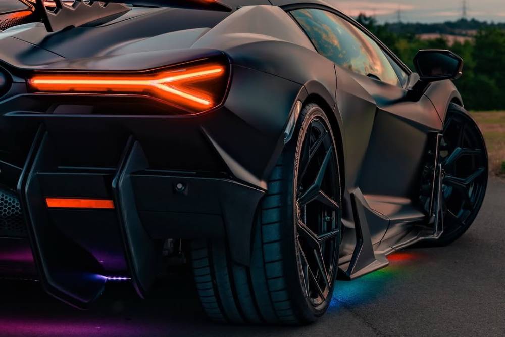 Εκ πρώτης όψεως, η κατάμαυρη Lambo ακολουθεί την πεπατημένη των βελτιωμένων supercars. Νέες ζάντες, χαμηλωμένη ανάρτηση, ανθρακονημάτινο αεροδυναμικό πακέτο, μεγάλη αεροτομή πίσω, γενικά ό,τι περιμένεις από μια Revuelto που έχει περάσει από χέρια tuner. Εδώ έχουμε να κάνουμε με το demo car της Vossen, που διαφημίζει με τον καλύτερο τρόπο το μοντέλο NL4. Εκεί που πραγματικά ξεχωρίζει η σεταρισμένη Ιταλίδα ωστόσο, είναι από κάτω. Παρατηρούμε τους λαχανί και μωβ χρωματισμούς που ντύνουν το οδόστρωμα. Πόθεν προέρχονται; Από μπάρες LED που τοποθετούνται στο πάτωμα, παραπέμποντας ευθέως στα Civic του Dom Toretto και της παρέας του!