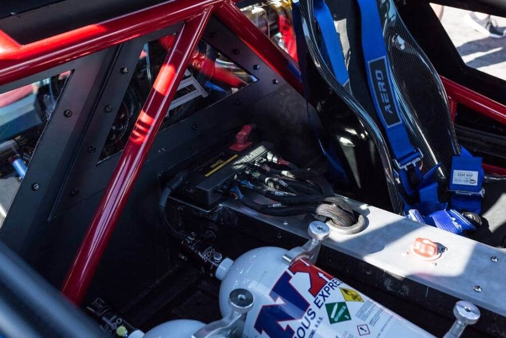 Όπως είπαμε, η μπλε Gallardo (μοντέλο του 2005) είναι στημένη για αγώνες. Κατά συνέπεια, στο εσωτερικό συναντάμε μόνο όσα βοηθούν τον οδηγό στην επίτευξη χρόνων. Roll cage, «πύργος» κιβωτίου, ένα ψηφιακό πολυόργανο πίσω από το τιμόνι, μερικοί διακόπτες για τη λειτουργία του αυτοκινήτου, ένα μπάκετ και δυο μπουκάλες νίτρο εκεί που βρίσκονταν η θέση του συνοδηγού!