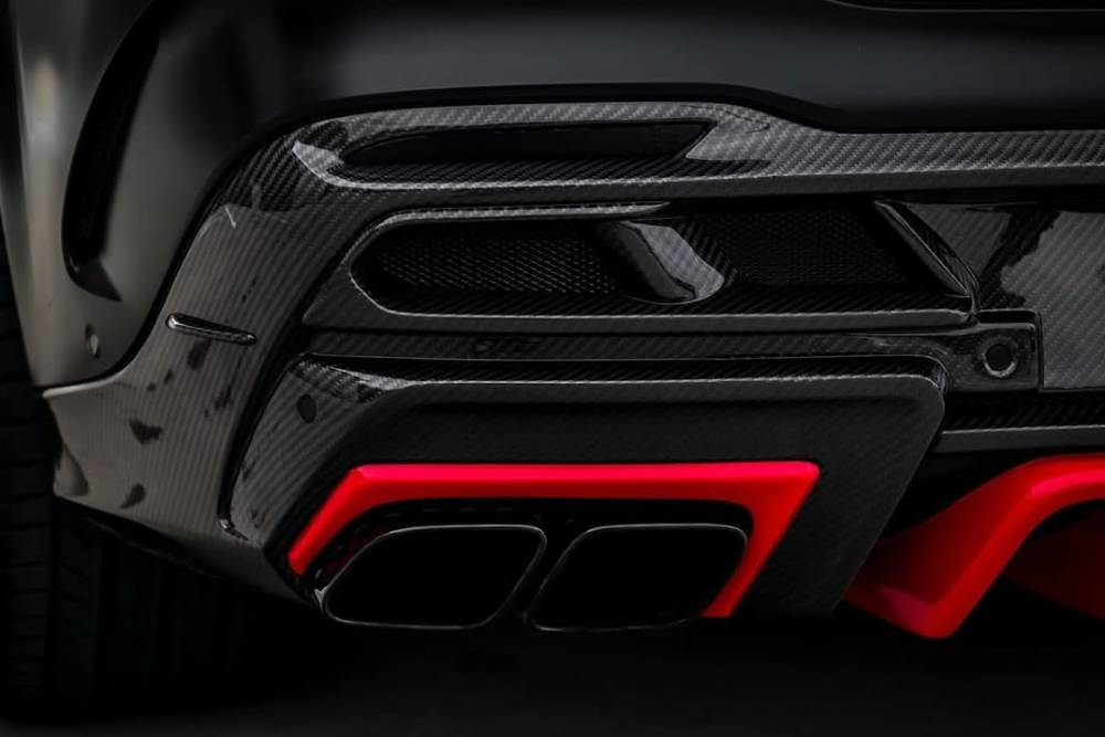 Η βελτιωμένη GLE 63 S εξωτερικά διαθέτει το ανθρακονημάτινο αεροδυναμικό πακέτο της Brabus, αλλά οι ζάντες και η ματ βαφή με τις κόκκινες πινελιές προέρχονται από τους Αμερικανούς, που ανέλαβαν να ετοιμάσουν το αυτοκίνητο με εξαρτήματα από τον Γερμανό βελτιωτή. Οι πολυάκτινες 24άρες έρχονται «κουτί» στο αμάξωμα της GLE, κάνοντας μια ωραία αντίθεση σε σχέση με το κλασικό σχέδιο των Brabus, ενώ το χαμήλωμα της ανάρτησης κατά 20 χλστ. βελτιώνει τόσο την εμφάνιση όσο και το στήσιμο. Μια βελτίωση που χρειάζεται, καθώς κάτω από το καπό πλέον φιλοξενείται σημαντικά μεγαλύτερη δύναμη.