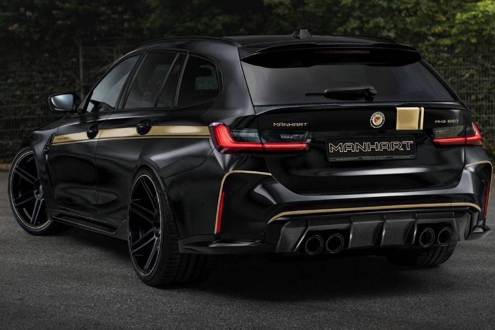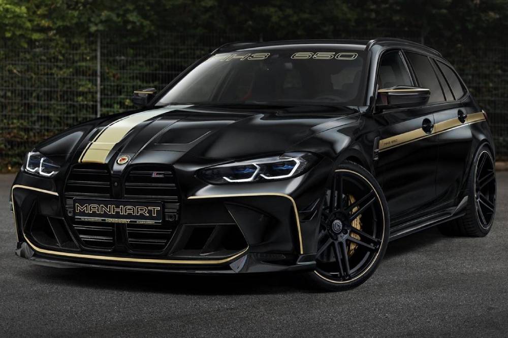 Ο Γερμανός βελτιωτής δεν αφήνει σε ησυχία της δημιουργίες των Βαυαρών, με τη M3 Touring να μην αποτελεί φυσικά εξαίρεση. Εξωτερικά, ο κλασικός -για αυτοκίνητο της Manhart– χρωματικός συνδυασμός μαύρου-χρυσαφί κεντρίζει τα βλέμματα. Οι λωρίδες στις πόρτες και από το πάνω μέρος της αμφιλεγόμενης μάσκας μέχρι πίσω, χαρίζουν μοναδική παρουσία στο σεντάν της BMW. Οι λεπτομέρειες ίδιου χρώματος στους προφυλακτήρες και τις ζάντες των 21 ιντσών, σε ελαστικά 255/30 και 295/25 εμπρός-πίσω, εξασφαλίζουν πως κανείς δεν πρόκειται να μπερδέψει M3 ή M4 της Manhart με οποιαδήποτε άλλη. Το αεροδυναμικό πακέτο από ανθρακονήματα (splitter εμπρός, πλαίνές ποδιές, διαχύτης και αεροτομή πίσω) και η χαμηλωμένη ανάρτηση της H&R (-30 χλστ. εμπρός, -10 χλστ. πίσω) ολοκληρώνουν το πιο απειλητικό look.