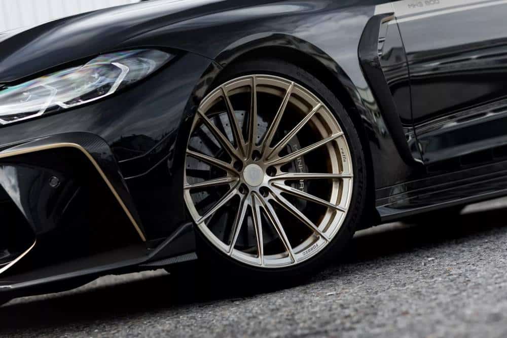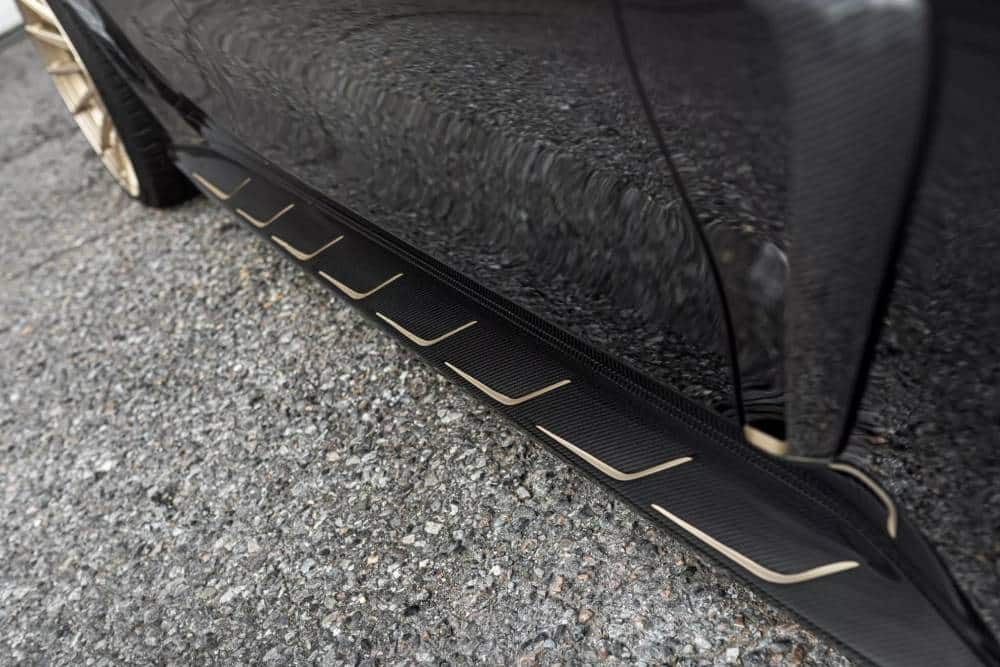 Ο Γερμανός βελτιωτής δεν αφήνει σε ησυχία της δημιουργίες των Βαυαρών, με τη M3 Touring να μην αποτελεί φυσικά εξαίρεση. Εξωτερικά, ο κλασικός -για αυτοκίνητο της Manhart– χρωματικός συνδυασμός μαύρου-χρυσαφί κεντρίζει τα βλέμματα. Οι λωρίδες στις πόρτες και το περίγραμμα της αμφιλεγόμενης μάσκας μέχρι πίσω, χαρίζουν μοναδική παρουσία στο σεντάν της BMW. Οι λεπτομέρειες ίδιου χρώματος στους προφυλακτήρες, τα carbon αεροδυναμικά στοιχεία και τις ζάντες των 21 ιντσών, σε ελαστικά 255/30 και 295/25 εμπρός-πίσω, εξασφαλίζουν πως κανείς δεν πρόκειται να μπερδέψει M3 ή M4 της Manhart με οποιαδήποτε άλλη. Το αεροδυναμικό πακέτο από ανθρακονήματα (splitter εμπρός, πλαίνές ποδιές, διαχύτης και αεροτομή πίσω) και η χαμηλωμένη ανάρτηση της H&R (-30 χλστ. εμπρός, -10 χλστ. πίσω) ολοκληρώνουν το πιο απειλητικό look.