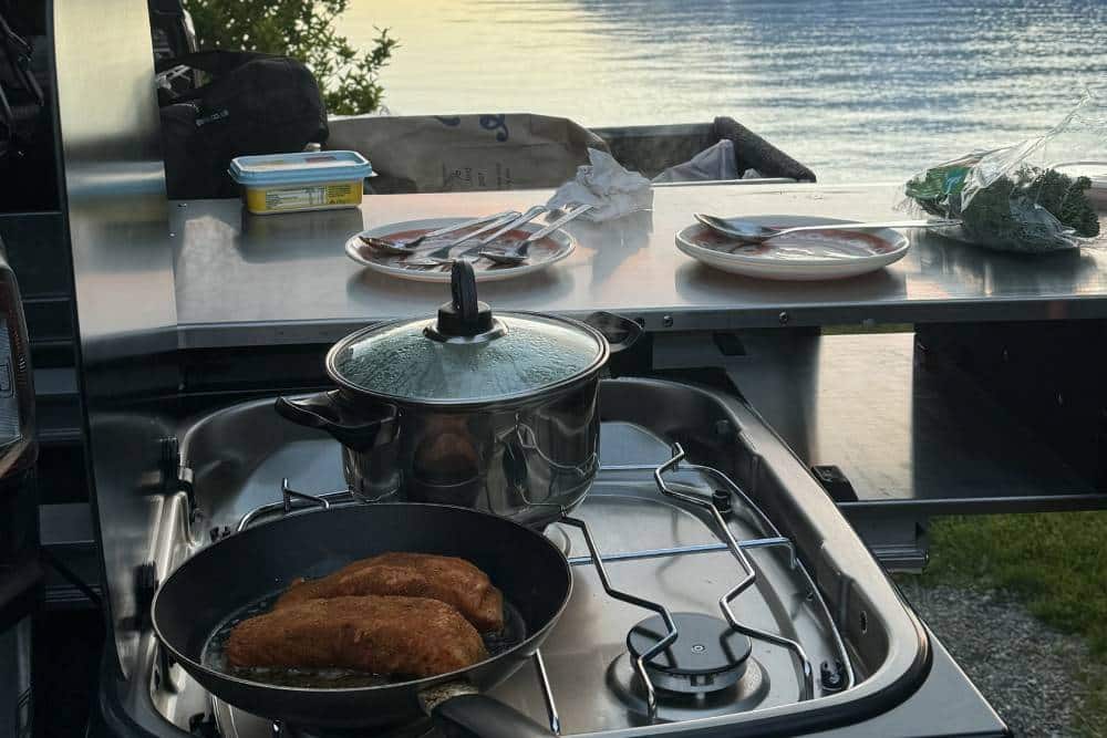 Πέρα από τους τροχούς τώρα, η μάσκα είναι ανασχεδιασμένη, τα φτερά φουσκωμένα και τα αυτοκόλλητα στις πόρτες συμβάλλουν στην τόνωση του hardcore χαρακτήρα. Το επίκεντρο, ωστόσο, είναι στο πίσω μέρος. Εκεί που κανονικά συναντάμε την καρότσα, τώρα υπάρχει κάλυμμα κι από πάνω του, μια πτυσσόμενη σκηνή ικανή να φιλοξενήσει 2 άτομα. Στο εσωτερικό του καλύμματος, βρίσκουμε εστία με 3 μάτια που λειτουργεί με υγραέριο, πτυσσόμενο πάγκο, αλλά και νεροχύτη! Παρά το σκληρό παρουσιαστικό, η Arctic Trucks έχει φροντίσει και την καμπίνα του AT35. Νέα προσκέφαλα που φέρουν ραμμένα τα αρχικά «ΑΤ», όπως και τα ανάλογα πατάκια «Arctic Trucks Floor Mats». Επιπλέον έχει τοποθετηθεί ένα νέο infotainment με οθόνη 9 ιντσών κι 8 ηχεία, ενώ για τη διευκόλυνση στο παρκάρισμα υπάρχει κάμερα οπισθοπορείας, αλλά και αισθητήρες στάθμευσης.