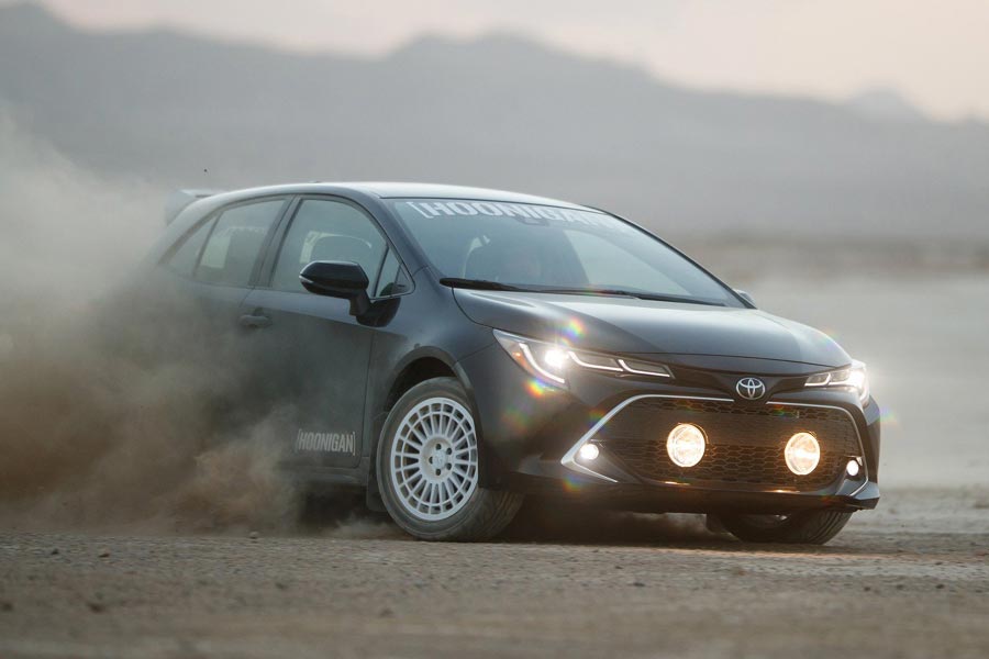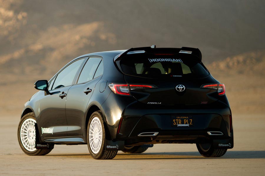 Για το τέλος αφήσαμε το Toyota Corolla που έγινε σε συνεργασία με την Hoonigan και αντλεί την έμπνευσή του από τα αγωνιστικά αυτοκίνητα των Ράλι πίσω στην δεκαετία του ΄90. Προκειμένου να παραπέμπει σε αυτά, έχει στο εμπρός μέρος δύο προβολείς της Hella και ζάντες αλουμινίου Fifteen52 Integrale. Επιπλέον, διαθέτει νέα ελατήρια, νέους αεραγωγούς, νέα εξάτμιση και αγωνιστικά μπάκετ καθίσματα.