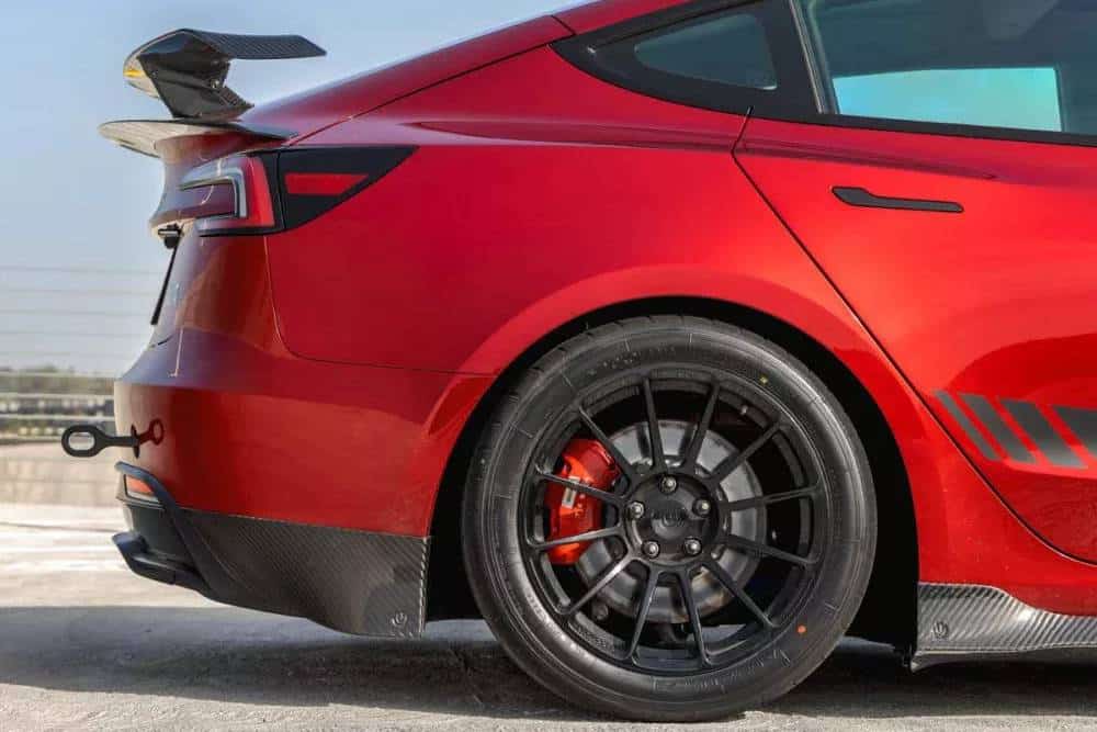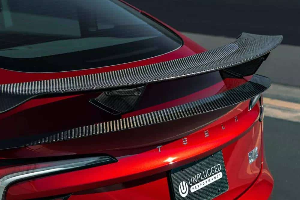 Για τους απαιτητικούς, η Unplugged Performance αναλαμβάνει να εμπλουτίσει την «γκαρνταρόμπα» του κορυφαίου Model 3, παρουσιάζοντας ένα ειδικά εξελιγμένο για αυτό αεροδυναμικό πακέτο. Όσο διακριτικό, αλλά συνάμα θελκτικό, στο μάτι πρέπει, αποτελούμενο από ανθρακονημάτινα μέρη στις κλασικές γωνίες ενός αυτοκινήτου: splitter στον εμπρός προφυλακτήρα, διαχύτης στον πίσω, ποδιές στο πλάι. Οι γραμμές τους σχεδιάστηκαν με βάση εκείνες του Model 3, προκειμένου να διατηρηθεί η οπτική συνάφεια και να επιτευχθεί το βέλτιστο αρμονικά αποτέλεσμα, όπως πολύ πετυχημένα δείχνει η αεροτομή στο πίσω μέρος, που θυμίζει αγωνιστική κατασκευή. Η Unplugged αναφέρει πως οι βελτιώσεις της επιδρούν θετικά και στα δυναμικά χαρακτηριστικά, προσθέτοντας κάθετη δύναμη (+193 κιλά) και μειώνοντας τους χρόνους πίστας.