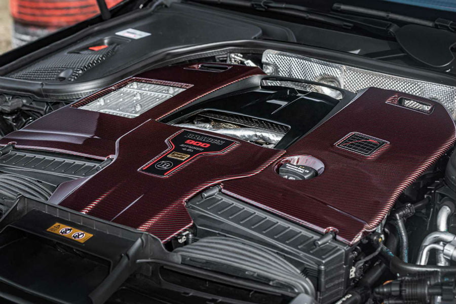 Ο 4λιτρος V8 twinturbo έχει υπερκυβιστεί στα 4.5 λίτρα, υπερσυμπιεζόμενος από δυο μεγαλύτερες custom τουρμπίνες της Brabus. Μαζί τους, μεγαλύτερα intercooler, νέα ψυγεία λαδιού και ανθρακονημάτινη πολλαπλή εισαγωγής, μετά δυο έξτρα ram air εκατέρωθεν της μάσκας για την ψύξη του μοτέρ. Η εξάτμιση είναι επίσης νέα και τιτανίου, ενώ δεν θα μπορούσε να λείπει η νέα ηλεκτρονική μονάδα διαχείρισης όλων των ανωτέρω. Το τελικό αποτέλεσμα είναι ένα συγκλονιστικό νούμερο 900 ίππων και 1.250 Nm ροπής, τα οποία περιορίζονται ηλεκτρονικά στα 1.054, προκειμένου να μην υπάρχουν ζητήματα με τη μετάδοση. Μιλάμε, δηλαδή, για αύξηση 261 ίππων και 250 Nm (150 με τον περιοριστή) σε σχέση με την GT63 S 4MATIC.
