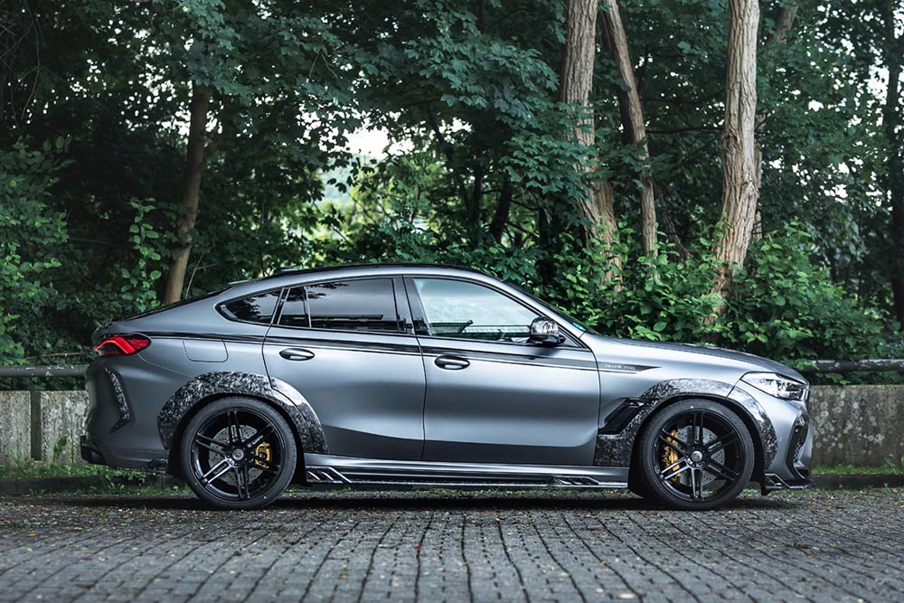 Η αρχή έγινε από την εξωτερική εμφάνιση του αυτοκινήτου, με τους βελτιωτές να «ντύνουν» στην Χ6 Μ με ένα ανθρακί ματ χρώμα (Matte Charcoal Metallic), προσθέτοντας παράλληλα μικρές λεπτομέρειες σε μερικά σημεία του αμαξώματος που θυμίζουν γρανίτη. Σαφώς κι έχει τοποθετηθεί ένα νέο bodykit που αποτελείται από νέους προφυλακτήρες εμπρός και πίσω, sideskirts και νέες ζάντες 22 ιντσών, με ελαστικά διαστάσεων 295/30 εμπρός και 315/30 πίσω, με τα νέα ελατήρια να χαμηλώνουν το αμάξωμα κατά 30 χλστ. Το συγκεκριμένο project η Manhart το βάφτισε MHX6 700 WB.