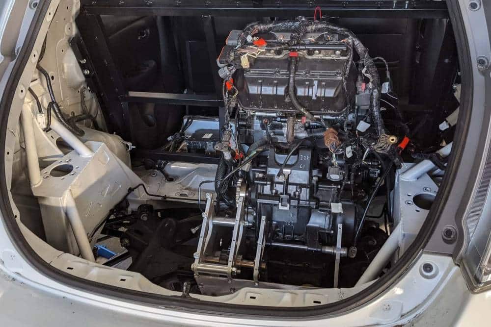 Ο Young αποφάσισε να μετατρέψει το Leaf σε plug-in υβριδικό, τοποθετώντας τον ατμοσφαιρικό των 998 κ.εκ. από τη μοτοσικλέτα πίσω. Η ιδέα ήταν η εξής: στην πόλη να κινείται με τον ηλεκτροκινητήρα και σε κάθε άλλη περίπτωση, με τον βενζινοκινητήρα. Ένα κανονικότατο plug-in υβριδικό δηλαδή, που αφενός καλύπτει την αδυναμία της μπαταρίας αφετέρου μετατρέπει το ιαπωνικό EV σε «όπλο». Η τοποθέτηση του τετρακύλινδρου μοτέρ δεν ήταν απλή υπόθεση, επιβάλλοντας μέχρι την τοποθέτηση υποπλαισίου και αξόνων από Lexus IS 350 προκειμένου να κουμπώσει. Ο ηλεκτροκινητήρας παρέμεινε στη θέση του (μπροστά), ωστόσο έγιναν εκτεταμένες αλλαγές στα ηλεκτρονικά/ηλεκτρολογικά προκειμένου να «παντρευτεί» με τις πιστονιές του Kawasaki.