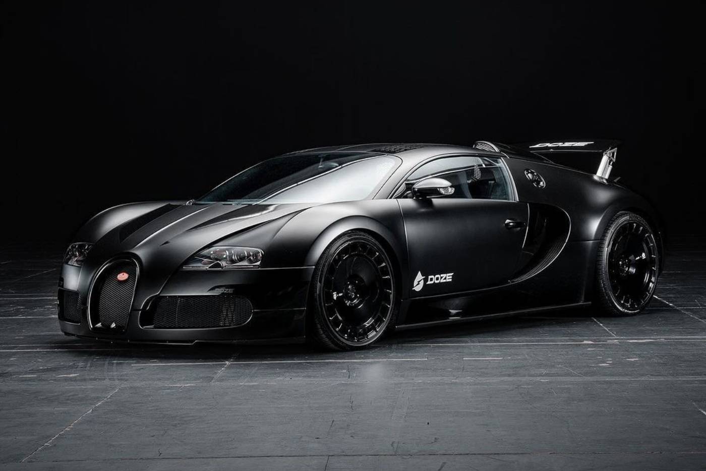 H Doze Performance ανέλαβε να ντύσει τη Veyron στα μαύρα, περνώντας ολόκληρο το αμάξωμα ένα ματ «χεράκι» (gloss black οι ζάντες) και προσθέτοντας στοχευμένα αεροδυναμικά στοιχεία, κυρίως στο πλάι και τον διαχύτη. Η ανάρτηση δεν είναι χαμηλωμένη aftermarket, απλά ρυθμισμένη στο κατώτερο σημείο της – όπως φανερώνει και η σηκωμένη αεροτομή, μέρος του mode που ξεκλειδώνει την πλήρη δυναμική του 8.0 W16 quadturbo προς τα 407 χλμ./ώρα τελικής. Για να φρεσκάρουμε τις μνήμες μας, η απλή Veyron (γιατί υπάρχει κι η SS) παρέχει 1.001 ίππους και 1.250 Nm στο δεξί πόδι του οδηγού, επιτρέποντας πέρα από τα 400+ χλμ./ώρα τελικής, 0-100 χλμ./ώρα σε 2,5 δλ., 0-200 χλμ./ώρα σε 7,3 δλ. και 0-300 χλμ./ώρα σε 16,7 δλ.