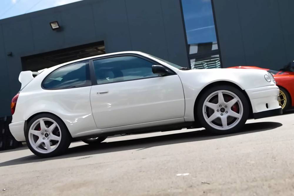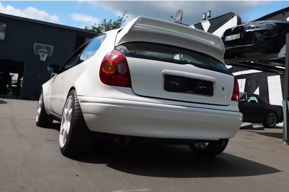 Το κατάλευκο και πιστό αντίγραφο εμφανισιακά του Corolla WRC που βλέπουμε, μας έρχεται από τη Γερμανία και το βελτιωτή JP Performance GmbH. To «κουβούκλιο» μπορεί να προέρχεται από Corolla G6, ωστόσο η μηχανολογική βάση (και η καμπίνα) είναι πολύ πιο σύγχρονη και δυνατή. Ένα GR Yaris αναλαμβάνει να απογειώσει το μεταλλαγμένο E110, φέροντας όλα τα προσόντα του. Και ο 1.600άρης τρικύλινδρος τούρμπο κάτω από το καπό, σε ελαφρώς βελτιωμένη μορφή 305 ίππων και 400 Nm μάλιστα, και το ηλεκτρονικά ελεγχόμενο σύστημα τετρακίνησης GR-Four και φυσικά, το 6άρι χειροκίνητο κιβώτιο. Βάλτε επίσης τα φουσκωμένα φτερά, τα φαρδύτερα μετατρόχια, τη νέα ανάρτηση, την τεράστια αεροτομή και τις 18άρες της Speedline, κι έχετε ό,τι πιο κοντινό σε Corolla WRC – τόσο οπτικά, όσο και μηχανικά/από πλευράς απόδοσης.