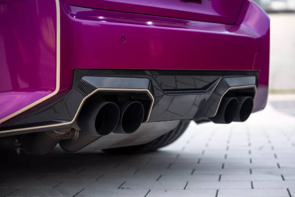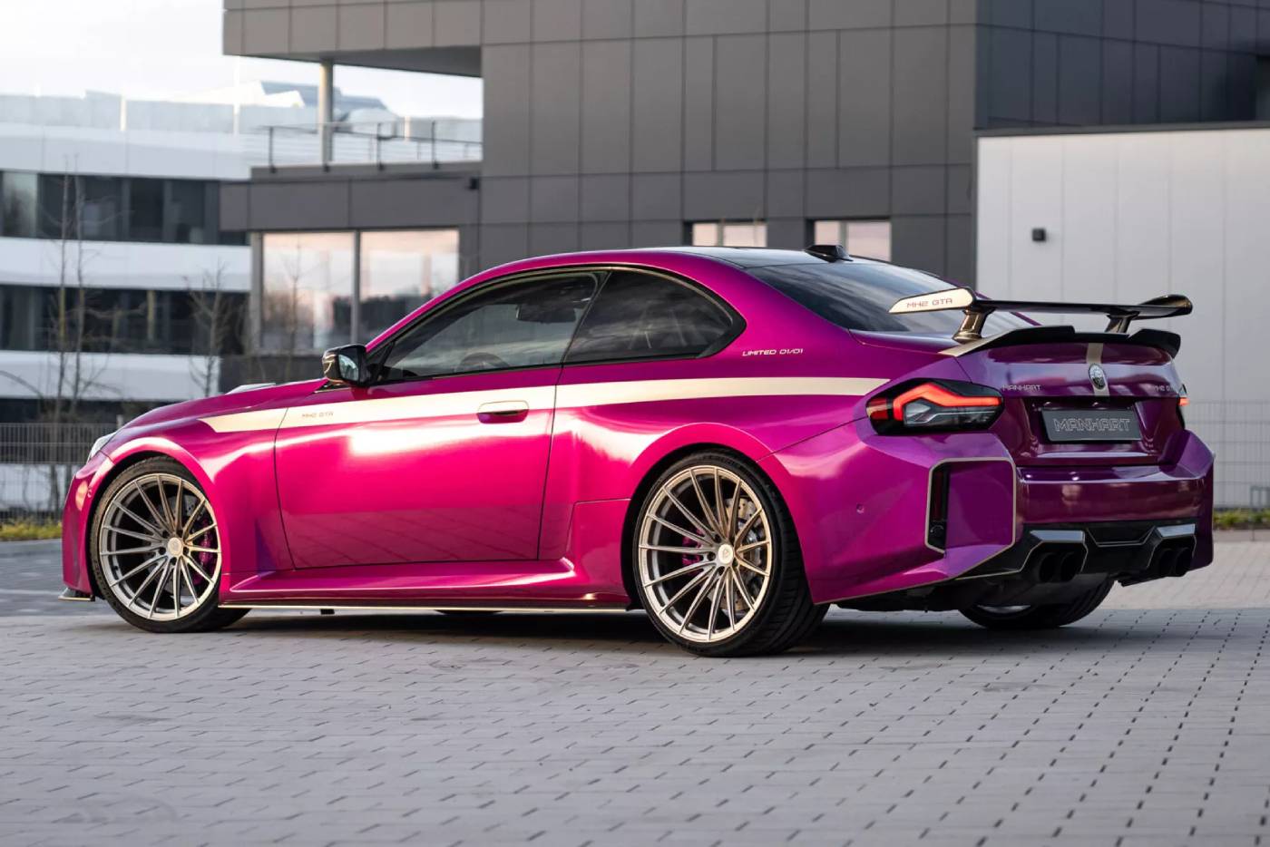 Πηγή έμπνευσης αποτέλεσε η αγωνιστική M4 GTR, που συμμετέχει στα πρωταθλήματα αντοχής, και φαίνεται με την πρώτη ματιά. Η MH2 GTR II, γιατί υπάρχει και η Ι, βγάζει μάτι καταρχάς με το φανταχτερό OTT Magenta χρώμα, που συνδυάζεται με τις -καθιερωμένες για αυτοκίνητο της Manhart– χρυσαφί πινελιές στο αμάξωμα. Εδώ το χρώμα του χρυσού πηγαίνει ένα βήμα παραπέρα και ντύνει και τις εντυπωσιακές ζάντες, διάστασης 20 ιντσών μπροστά και 21 πίσω. Μόνος του ο χρωματικός συνδυασμός θα έκανε μεγάλη διαφορά σε σχέση με την εργοστασιακή M2, αλλά εδώ έχουμε να κάνουμε με GTR.