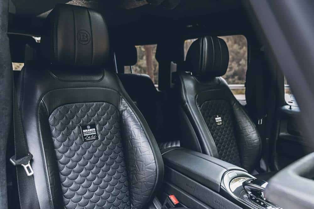 H κτηνώδης και κατάμαυρη G-Class ξεχειλίζει οπτικά μέσω των φαρδύτερων φτερών, των εξίσου φαρδύτερων μετατροχιών, της χαμηλωμένης κατά 45 χλστ. ανάρτησης, των ανθρακονημάτινων αεροδυναμικών προσθηκών, του νέου καπό με τις ευμεγέθεις εισαγωγές και, φυσικά, τις 24άρες ζάντες με τα πελώρια ελαστικά. Τα λογότυπα της Brabus στη μάσκα και το κάλυμμα της ρεζέρβας δεσπόζουν, ενώ στην οροφή συναντάμε διπλές μπάρες LED.