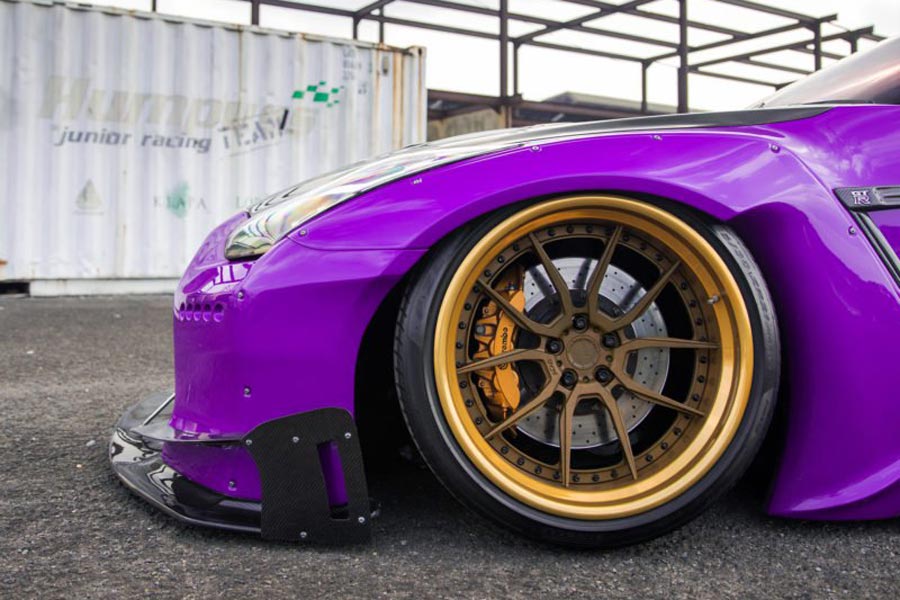 Όπως βλέπετε και στις εικόνες ο ιδιοκτήτης αυτού του Nissan GT-R έχει επιλέξει μία μωβ μεμβράνη για να ντύσει το αμάξωμα του ιαπωνικού supercar, το οποίο έχει wide body kit της Rocket Bunny που απαρτίζεται από φαρδύτερα φτερά, σπόιλερ περιμετρικά του αμαξώματος, νέους προφυλακτήρες και αεροτομή από ανθρακονήματα.