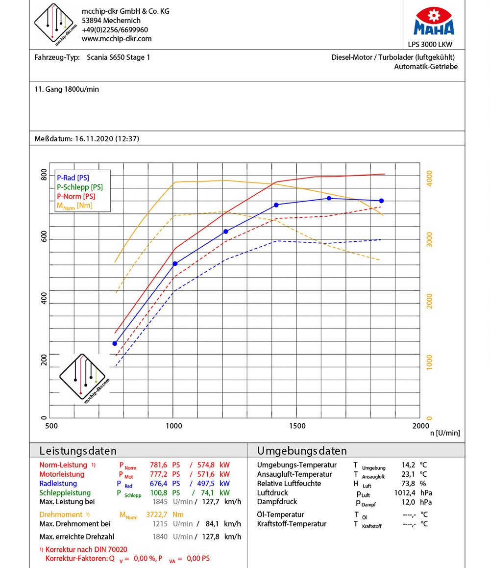 Στην συγκεκριμένη όμως περίπτωση, είναι πολύ εντυπωσιακή η θέα ενός θηριώδους φορτηγού Scania να ανεβαίνει στο δυναμόμετρο για να μετρηθεί ο ενισχυμένος κινητήρας του. Πρόκειται για το επιβλητικό Scania S 650 Euro 6, με τον V8 32βάλβιδο ντίζελ των 16.353 κ.εκ. και βάρους 1.340 κιλών, εργοστασιακής απόδοσης 650 ίππων στις 1.900 σ.α.λ. και 3.300 Nm ροπής στις 950-1.350 σ.α.λ. Με τη βελτιστοποίηση του λογισμικού που κάνει ο βελτιωτής mcchip-dkr, το Scania S 650, όχι μόνο ανεβαίνει σε απόδοση, αλλά μειώνεται η κατανάλωση κατά 10-15%. Με κόστος 999 ευρώ, το ισχυρό μηχανικό σύνολο αποκτά επιπλέον 75 ίππους συν 270 Nm ροπής και φτάνει τους 725 ίππους και τα 3.570 Nm ροπής.