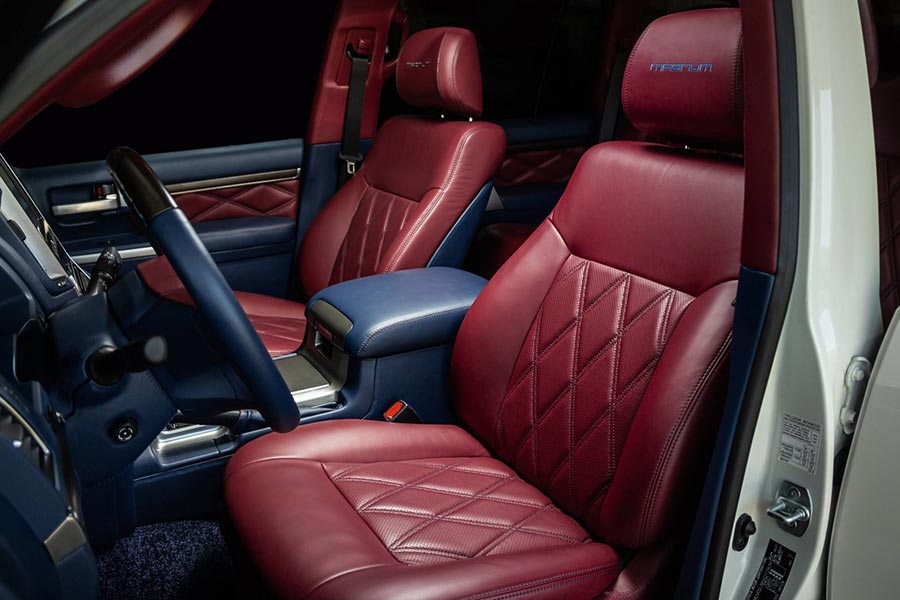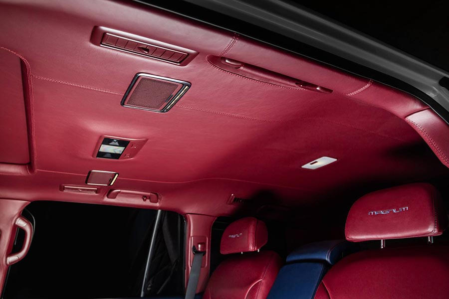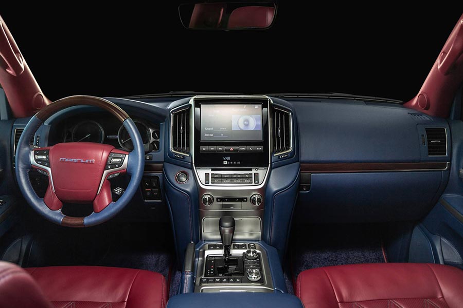 Εξίσου περιποιημένη είναι και η καμπίνα του Toyota Land Cruiser, όπου ξεχωρίζει η διχρωμία. Σύμφωνα με την AutoLife τα πάντα στο εσωτερικό, μέχρι και η οροφή έχουν ντυθεί με δέρμα υψηλής ποιότητας από την Αυστρία. Κερασάκι στη τούρτα το ραμμένο όνομα Magnum (έτσι ονόμασε ο βελτιωτής το συγκεκριμένο project) στα προσκέφαλα των καθισμάτων, στο κεντρικό υποβραχιόνιο, ακόμα και στο τιμόνι!