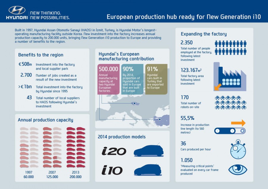 Σήμερα πέρασε από την γραμμή παραγωγής του εργοστασίου Hyundai Assan Otomotiv Sanayi (HAOS) στη Νικομήδεια της Τουρκίας το πρώτο νέο Hyundai i10, το οποίο παρουσιάστηκε επίσημα στο Σαλόνι Αυτοκινήτου της Φρανκφούρτης. Η ετήσια παραγωγή του ανέρχεται στις 200.000 μονάδες, ενώ στο εργοστάσιο επενδύθηκαν 508 εκ. ευρώ και δημιουργήθηκαν 2.700 νέες θέσεις εργασίας.