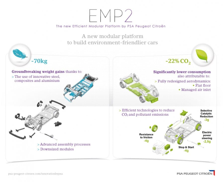 Μιας νέας γενιάς ευέλικτη πλατφόρμα παρουσίασε ο όμιλος PSA, πάνω στην οποία αρχικά θα «χτιστούν» τα νέα Peugeot 308 και Citroen C4 Picasso (βρίσκονται σε δοκιμές στους δρόμους). Η πλατφόρμα EMP2 (Efficient Modular Platform 2) προσφέρει μια σειρά από πλεονεκτήματα, όπως είναι η εξοικονόμηση βάρους 70 κιλών χάρη στην χρήση ατσαλιού πολύ υψηλής αντοχής και τμημάτων από αλουμίνιο, η δυνατότητα εφαρμογής υψηλών τεχνολογιών που επιτρέπουν μείωση των εκπομπών CO2 κατά 22% και η δυνατότητα εφαρμογής της σε διαφόρους τύπους αμαξωμάτων. Επιπλέον παρέχει μεγαλύτερη ασφάλεια, οδηγική απόλαυση και άνεση.
