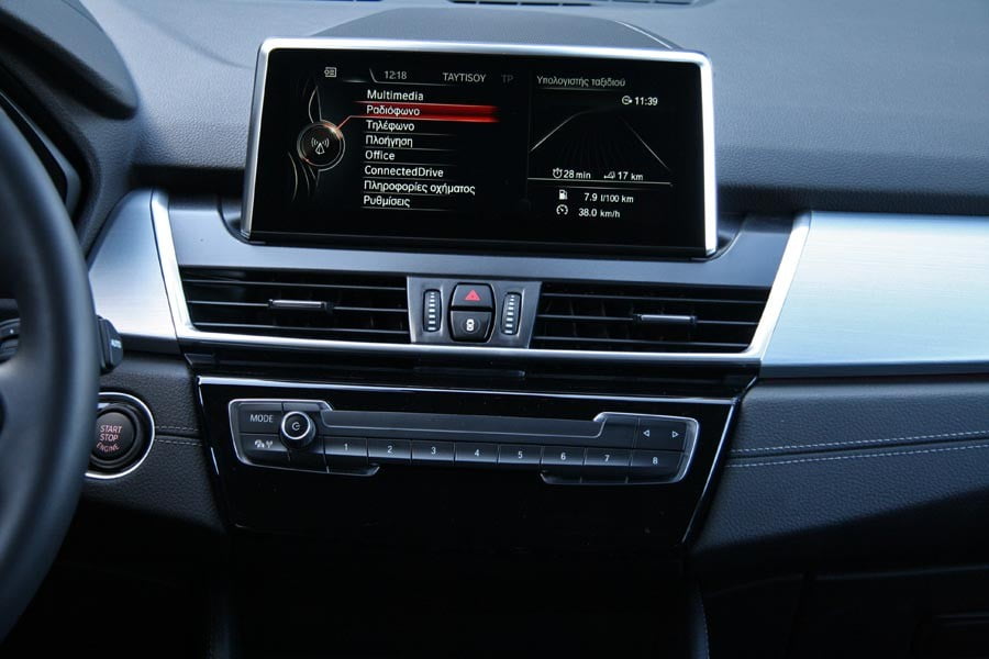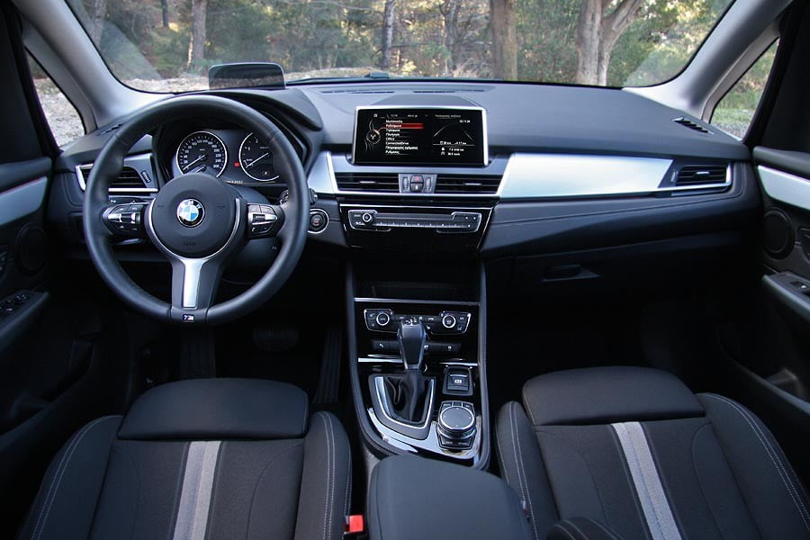Θα μπορούσε να πει κανείς πως μπαίνοντας στο εσωτερικό της BMW Σειρά 2 Active Tourer βρίσκεται ίσως στην πιο ολοκληρωμένη καμπίνα που έχει δημιουργήσει ποτέ η γερμανική μάρκα. Και αυτό γιατί σε όλα της τα θετικά στοιχεία που συναντάμε και σε άλλα μοντέλα της εταιρείας, εδώ έχουμε επιπλέον αυξημένη ευρυχωρία και πρακτικότητα. Έχοντας οδηγήσει από την οικονομικότερη BMW έως και την πιο ακριβή, αντιλαμβάνεσαι πως η ποιότητα στο εσωτερικό ενός αυτοκινήτου είναι αδιαπραγμάτευτη για την γερμανική μάρκα και η Σειρά 2 Active Tourer δεν θα μπορούσε να αποτελέσει εξαίρεση. Τα υλικά που έχουν χρησιμοποιηθεί είναι ποιοτικά και ικανοποιούν σε όψη και αφή, έχουν άψογο φινίρισμα και η συναρμογή τους σε πείθει πως δεν θα τρίξουν ποτέ. Ο σχεδιασμός είναι γνώριμος από τη Σειρά 2, όπως άλλωστε και η εργονομία η οποία είναι σε πολύ καλό επίπεδο. Εξοικείωση απαιτεί μόνο το iDrive, από το οποίο χειρίζεσαι το σύστημα πολυμέσων με την μεγάλη έγχρωμη οθόνη. Ιδανικά θα θέλαμε και ένα δεύτερο κουμπί για τον υπολογιστή ταξιδιού (να μπορείς να περιηγηθείς εμπρός-πίσω στο μενού και όχι μόνο εμπρός), οι ενδείξεις του οποίου προβάλλονται στον ευανάγνωστο πίνακα οργάνων, μέσω ψηφιακής οθόνης. Ο χώρος για οδηγό/συνοδηγό είναι άνετος και τα καθίσματα αναπαυτικά, ενώ οι θήκες μικροαντικειμένων είναι πολλές καθώς υπάρχουν τσέπες στις πόρτες, θήκη ανάμεσα στα καθίσματα και στο υποβραχιώνιο και ράφι στην κεντρική κονσόλα. Πίσω, δύο επιβάτες θα βολευτούν άνετα, ενώ αν είναι μεσαίου αναστήματος τρεις δεν θα έχουν πρόβλημα στο αναπαυτικό κάθισμα. Το τελευταίο προαιρετικά είναι και συρόμενο (αν και σε τέτοιου είδους αυτοκίνητο θα έπρεπε να είναι στάνταρ εξοπλισμός). Ο χώρος αποσκευών τέλος είναι στα 468 λίτρα, έχει διπλό πάτο και το σχήμα του παραμένει πλήρως εκμεταλλεύσιμο (χωρίς εξογκώματα και με επίπεδο δάπεδο), ακόμη και μετά την αναδίπλωση της πλάτης των πίσω καθισμάτων, οπότε και φτάνει στα 1.510 λίτρα.
