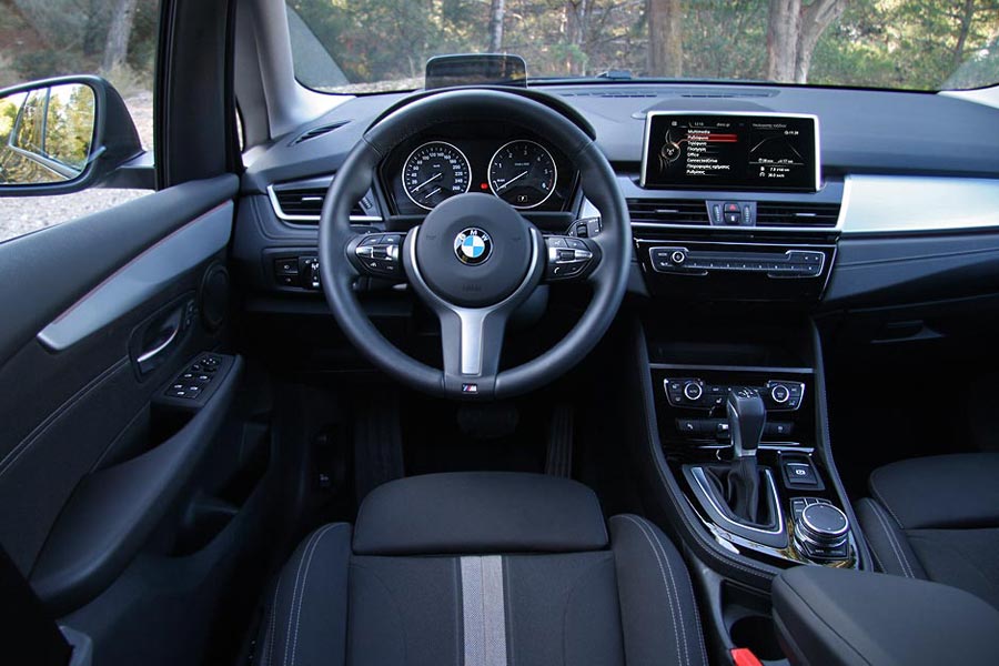 Θα μπορούσε να πει κανείς πως μπαίνοντας στο εσωτερικό της BMW Σειρά 2 Active Tourer βρίσκεται ίσως στην πιο ολοκληρωμένη καμπίνα που έχει δημιουργήσει ποτέ η γερμανική μάρκα. Και αυτό γιατί σε όλα της τα θετικά στοιχεία που συναντάμε και σε άλλα μοντέλα της εταιρείας, εδώ έχουμε επιπλέον αυξημένη ευρυχωρία και πρακτικότητα. Έχοντας οδηγήσει από την οικονομικότερη BMW έως και την πιο ακριβή, αντιλαμβάνεσαι πως η ποιότητα στο εσωτερικό ενός αυτοκινήτου είναι αδιαπραγμάτευτη για την γερμανική μάρκα και η Σειρά 2 Active Tourer δεν θα μπορούσε να αποτελέσει εξαίρεση. Τα υλικά που έχουν χρησιμοποιηθεί είναι ποιοτικά και ικανοποιούν σε όψη και αφή, έχουν άψογο φινίρισμα και η συναρμογή τους σε πείθει πως δεν θα τρίξουν ποτέ. Ο σχεδιασμός είναι γνώριμος από τη Σειρά 2, όπως άλλωστε και η εργονομία η οποία είναι σε πολύ καλό επίπεδο. Εξοικείωση απαιτεί μόνο το iDrive, από το οποίο χειρίζεσαι το σύστημα πολυμέσων με την μεγάλη έγχρωμη οθόνη. Ιδανικά θα θέλαμε και ένα δεύτερο κουμπί για τον υπολογιστή ταξιδιού (να μπορείς να περιηγηθείς εμπρός-πίσω στο μενού και όχι μόνο εμπρός), οι ενδείξεις του οποίου προβάλλονται στον ευανάγνωστο πίνακα οργάνων, μέσω ψηφιακής οθόνης. Ο χώρος για οδηγό/συνοδηγό είναι άνετος και τα καθίσματα αναπαυτικά, ενώ οι θήκες μικροαντικειμένων είναι πολλές καθώς υπάρχουν τσέπες στις πόρτες, θήκη ανάμεσα στα καθίσματα και στο υποβραχιώνιο και ράφι στην κεντρική κονσόλα. Πίσω, δύο επιβάτες θα βολευτούν άνετα, ενώ αν είναι μεσαίου αναστήματος τρεις δεν θα έχουν πρόβλημα στο αναπαυτικό κάθισμα. Το τελευταίο προαιρετικά είναι και συρόμενο (αν και σε τέτοιου είδους αυτοκίνητο θα έπρεπε να είναι στάνταρ εξοπλισμός). Ο χώρος αποσκευών τέλος είναι στα 468 λίτρα, έχει διπλό πάτο και το σχήμα του παραμένει πλήρως εκμεταλλεύσιμο (χωρίς εξογκώματα και με επίπεδο δάπεδο), ακόμη και μετά την αναδίπλωση της πλάτης των πίσω καθισμάτων, οπότε και φτάνει στα 1.510 λίτρα.