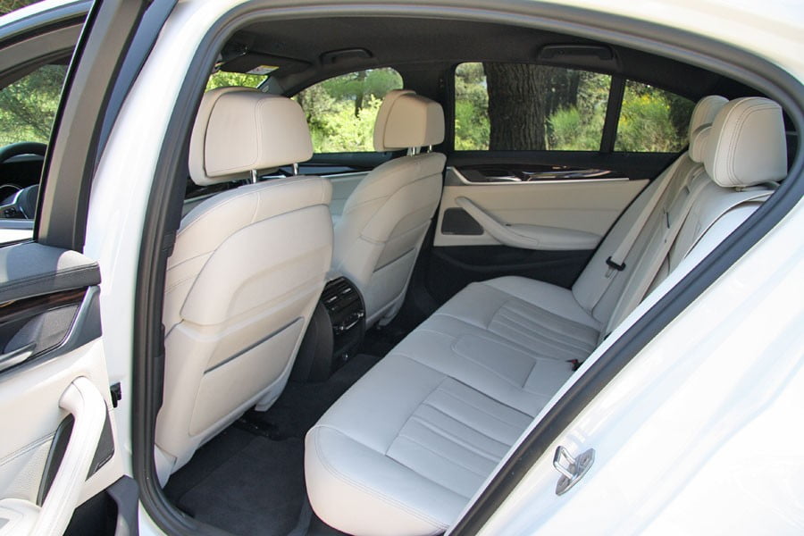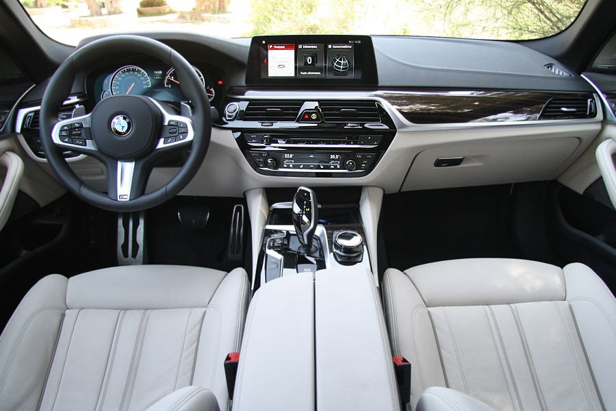 Το εσωτερικό της νέας BMW Σειρά 5 εκπέμπει το υψηλό τεχνολογικό υπόβαθρο του αυτοκινήτου, φροντίζοντας ώστε να εξοικειώσει όσο το δυνατόν περισσότερο τον οδηγό και τους υπόλοιπους επιβάτες με όλα τα τεχνολογικά «καλούδια» της νέας μεγάλης BMW. Έτσι λοιπόν, άρχουσα στο νέο ταμπλό που θυμίζει αυτό της μεγαλύτερης Σειρά 7 είναι η μεγάλη οθόνη των 10,25 ιντσών στην κονσόλα, που απεικονίζει το υπερπλήρες μενού για τα συστήματα ψυχαγωγίας, επικοινωνίας, ασφάλειας, συνδεσιμότητας και γενικότερα, για οτιδήποτε σχεδόν αφορά στο αυτοκίνητο. Μπροστά από τον οδηγό, ξεχωρίζει ο ψηφιακός πίνακας οργάνων που αλλάζει τις ενδείξεις και το χρωματισμό του ανάλογα με το επιλεγμένο πρόγραμμα οδήγησης (π.χ. κόκκινος στο «Sport»), ενώ στο ίδιο, υψηλό τεχνολογικό μοτίβο έρχεται και η οθόνη αφής για τον κλιματισμό χαμηλά στην κονσόλα. Η θέση οδήγησης είναι πολύ καλή και το κάθισμα –και το τιμόνι– ρυθμίζεται πολλαπλά και πάει μέχρι και πολύ χαμηλά, με την άνεση που προσφέρεται να είναι αντάξια ενός σεντάν του μεγέθους και κύρους της Σειρά 5. Ποιοτικά, τα υλικά που έχουν χρησιμοποιηθεί είναι τα ανώτερα δυνατά και η πολυτέλεια είναι έκδηλη ιδίως εφόσον επιλεγούν κάποια από τα 15 διαφορά διαθέσιμα δέρματα της γκάμας. Στον τομέα των χώρων, 5 άτομα δεν θα δυσκολευτούν να βρουν θέση στο άνετο εσωτερικό της «5άρας», ενώ και το πορτ-μπαγκάζ των 530 λίτρων (+10 λτ. σε σχέση με πριν), θα χωρέσει όλα τα απαραίτητα.