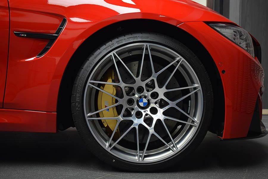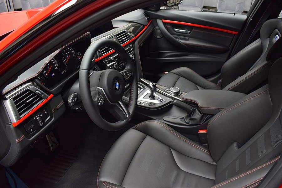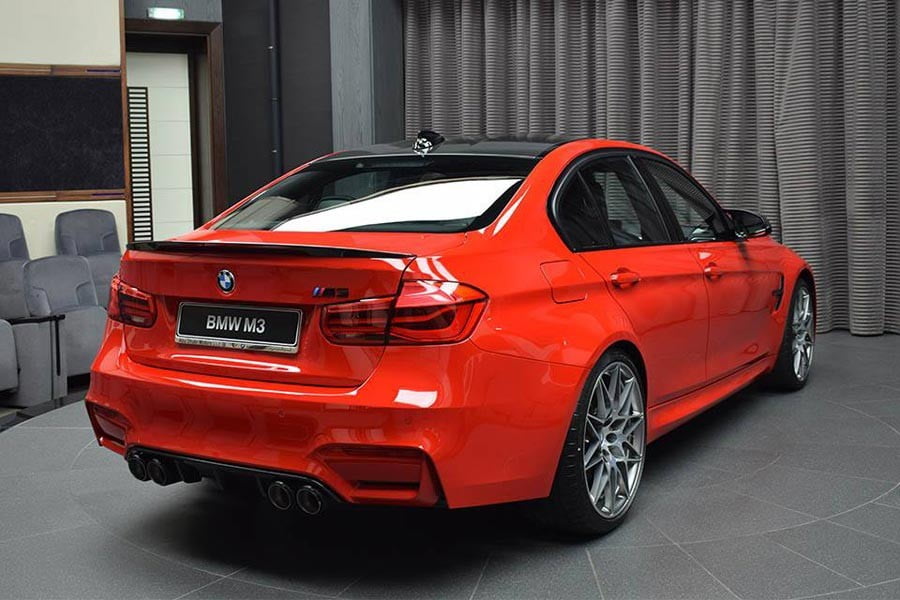Καταρχήν, το κατακόκκινο και υπέρλαμπρο χρώμα Ferrari Red που προέρχεται από τον κατάλογο εξατομίκευσης της μάρκας, σπάνια το βλέπει κανείς σε M3 και φαίνεται ότι της ταιριάζει πολύ. Παράλληλα συνδυάζεται με M Performance Aerodynamic Kit. Αυτό περιλαμβάνει διάφορα τμήματα από ανθρακόνημα, όπως είναι το σπόιλερ στον εμπρός προφυλακτήρα, τα καλύμματα των καθρεπτών, ο διαχύτης πίσω και η αεροτομή.