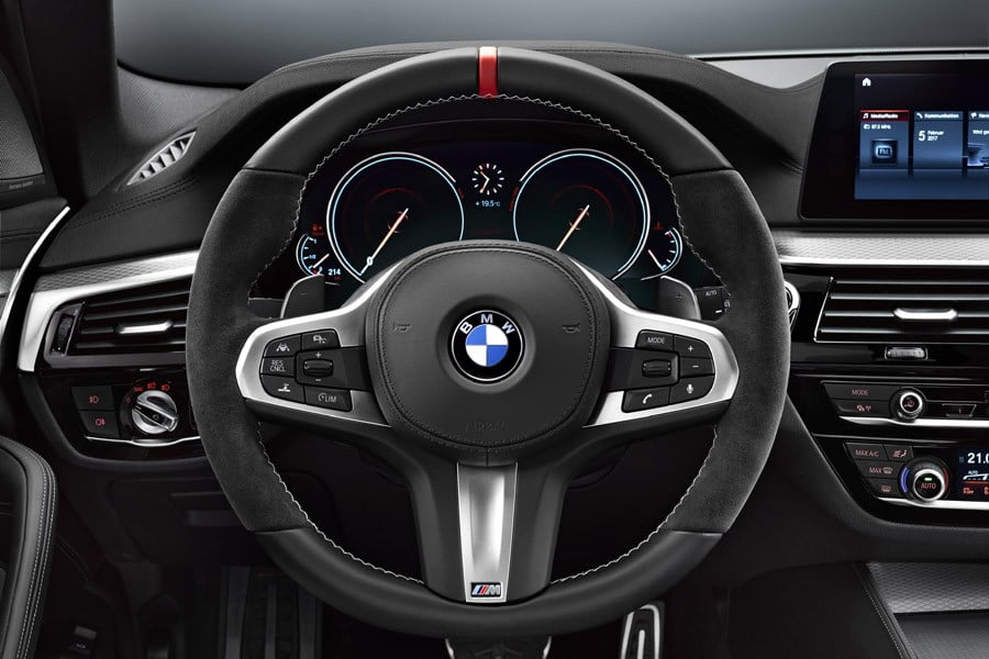 Φυσικά, το τμήμα M Performance τονίζει και την εμφάνιση της BMW Σειρά 5 Touring, προσφέροντάς της ένα νέο carbon εμπρόσθιο σπόιλερ, μαύρη γρίλια, πλαϊνά αυτοκόλλητα σε μαύρο χρώμα, αλλά και carbon καπάκια καθρεπτών. Οι ζάντες είναι 20 ιντσών και μπορούν να παραγγελθούν είτε σε ένα ειδικό γκρι χρωματισμό, είτε στη διχρωμία (ασημί-μαύρο) της Σειρά 5 Touring των φωτογραφιών μας.