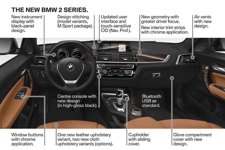Η νέα Σειρά 2 και η M2 έχουν αρκετές αλλά διακριτικές αλλαγές, οι οποίες δεν γίνονται αισθητές με την πρώτη ματιά. Συγκεκριμένα και όπως μπορείτε να δείτε και στις εικόνες πιο πάνω, η ανανεωμένη BMW Σειρά 2 διαθέτει ανασχεδιασμένο εμπρός μέρος με μεγαλύτερες εισαγωγές αέρα, μεγαλύτερη μάσκα, φώτα LED στάνταρ τόσο εμπρός όσο και πίσω, νέες ζάντες αλουμινίου και πλουσιότερη χρωματική παλέτα.