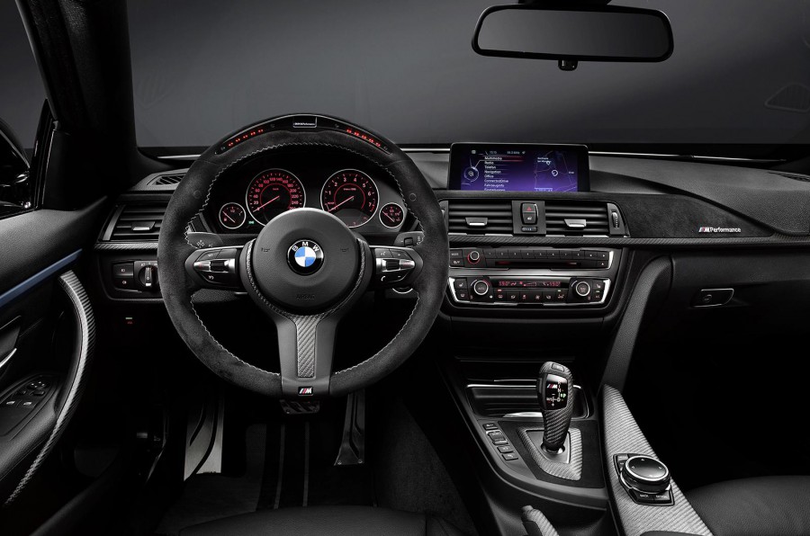 Στο εσωτερικό της η Σειρά 4 Μ Performance διαθέτει νέο τριάκτινο τιμόνι με επένδυση αλκαντάρας και ενσωματωμένο shift light σύστημα αλλαγής σχέσεων, νέα σπορ καθίσματα, αλουμινένια πεντάλ ενώ και εκεί το ανθρακόνημα τονίζει τον σπορ χαρακτήρα του πακέτου Μ και συναντάται σε πολλά μέρη όπως στο ταμπλό, στις επενδύσεις των θυρών, στο χειρόφρενο και τον επιλογέα ταχυτήτων.