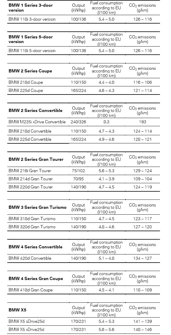 Στην πιο πρακτική BMW Σειρά 2 Gran Tourer προστίθεται η έκδοση 216i με 102 ίππους και η 214d με 95 ίππους (κινητήρες 1.5 λτ.), καθώς και η 220d με 2λιτρο ντίζελ 190 ίππων. Η αρχική 216i Gran Tourer επιταχύνει στα 0-100 χλμ./ώρα σε 11,9 δλ., ενώ κατανάλωση και εκπομπές CO2 ανέρχονται σε 5,3 λτ./100 χλμ. και 124 γρ./χλμ. Όσο για την 214d Gran Tourer τα αντίστοιχα νούμερα είναι 13,5 δλ., 3,9 λτ./100 χλμ. και 104 γρ./χλμ. Οι BMW Σειρά 3 Gran Turismo, Σειρά 4 Cabrio, Σειρά 4 Gran Coupe και X5 θα εφοδιάζονται με βελτιωμένους 4κύλινδρους ντίζελ 2.0 λτ. ισχύος 150 και 190 ίππων (+7hp).