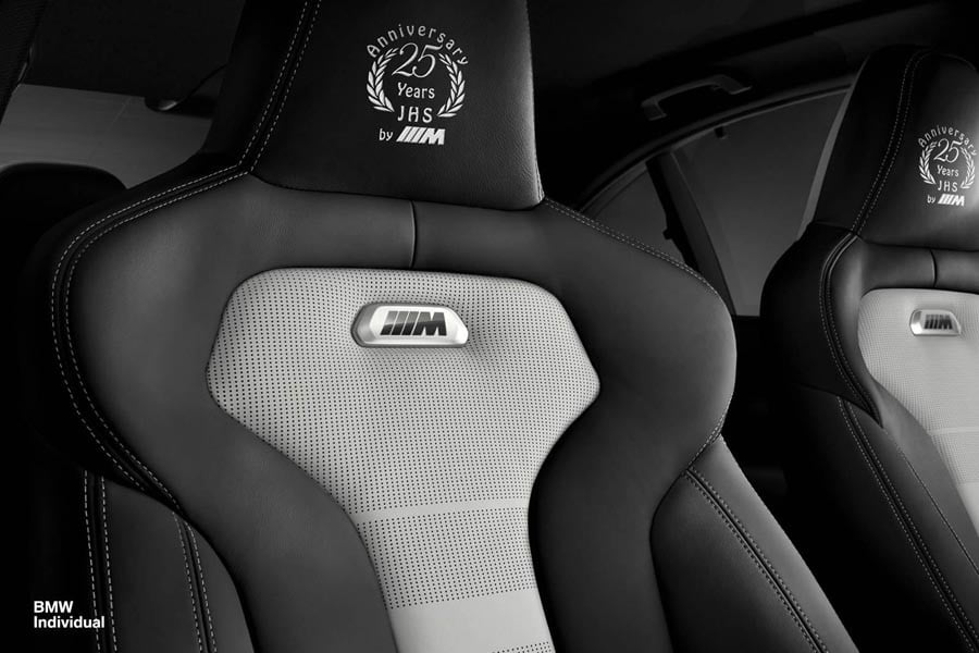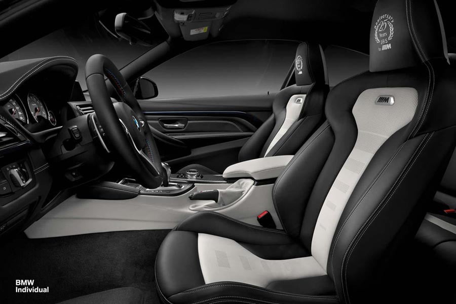 Στο εσωτερικό της επετειακής M4 Coupe όλες οι επιφάνειες είναι καλυμμένες με δίχρωμο δέρμα μαύρου – γκρι και ραφές που δημιουργούν αντίθεση. Στα προσκέφαλα έχουν προστεθεί επετειακά λογότυπα, ενώ στην κονσόλα, στο χειρόφρενο και στα καθίσματα τα λογότυπα M προσθέτουν τη δικιά τους πινελιά.