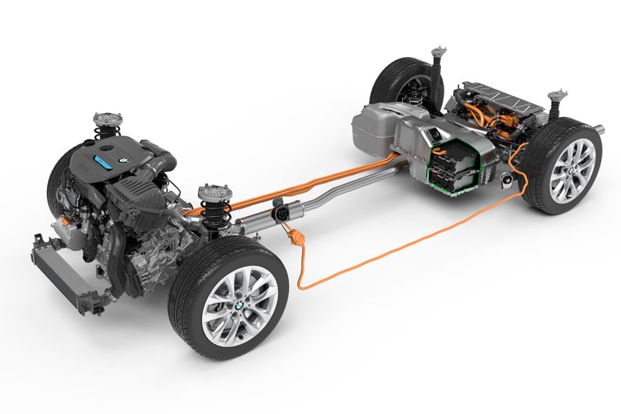 Το plug-in hybrid σύστημα αποτελείται από το νέο 3κύλινδρο κινητήρα 1.5 λτ. TwinPower Turbo ισχύος 136 ίππων και 220 Nm ροπής που στέλνει τη δύναμη στους εμπρός τροχούς και από ένα ηλεκτροκινητήρα απόδοσης 88 ίππων και 165 Nm ροπής (συνδυαστική απόδοσης 224 hp) στον πίσω άξονα. Το ηλεκτρικό μοτέρ αντλεί ενέργεια από μια μπαταρία ιόντων – λιθίου χωρητικότητας 7,7 kWh, που είναι τοποθετημένη κάτω από το πίσω κάθισμα και φορτίζει σε 2 ώρες και 15 λεπτά μέσω του BMW iWallbox ή σε μία ώρα περισσότερη μέσω οικιακής πρίζας.