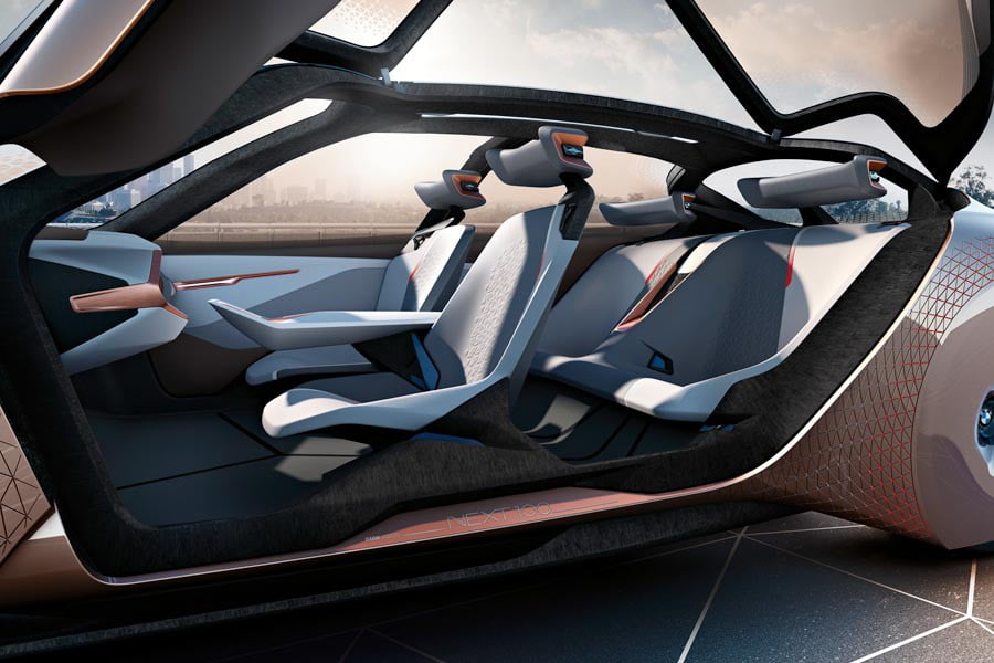 Το μήκους 4,9 μέτρων και ύψους 1,37 μέτρων BMW Vision Next 100 με τους μεγάλους καλυμμένους τροχούς και το «ρευστό» σχεδιαστικά αμάξωμα, έχει εξαιρετικά χαμηλό αεροδυναμικό συντελεστή Cd: 0,18. Φουτουριστική εικόνα διαθέτει και το εσωτερικό, το οποίο θυμίζει όχημα επιστημονικής φαντασίας και μάλλον καθόλου αυτοκίνητο, όπως το γνωρίζουμε.