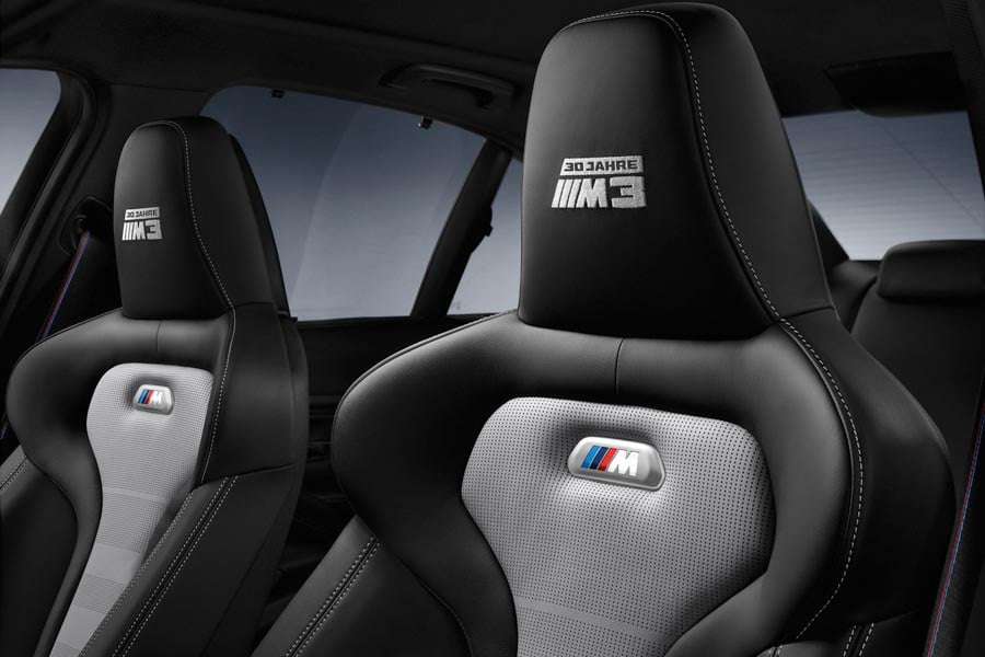 Στο εσωτερικό υπάρχουν σπορ καθίσματα M με το λογότυπο «M3 30 Jahre» στα προσκέφαλα, το οποίο συναντάται ακόμα στα διακοσμητικά των μασπιέ και στην ανθρακονημάτινη επένδυση του ταμπλό. Το τελευταίο είναι επενδυμένο με δέρμα, όπως και οι περισσότερες επιφάνειες στο εσωτερικό. Μοναδικά στοιχεία αποτελούν ακόμα η αριθμημένη πλακέτα «30 Years M3 1/500» και τα δίχρωμα καθίσματα σε μαύρο – μπλε ή μαύρο – γκρι.