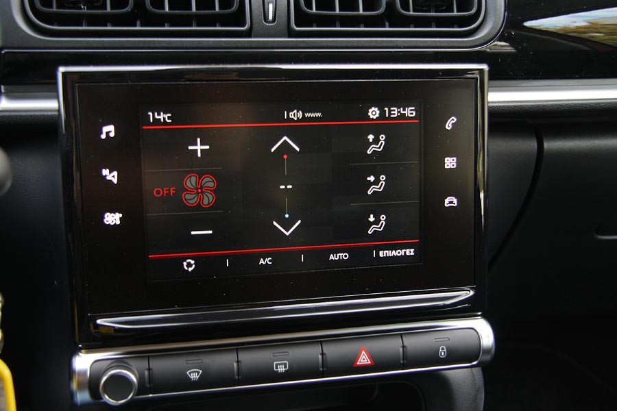 Περνώντας στο εσωτερικό του νέου C3, η σχεδιαστική φιλοσοφία παραμένει ίδια με αυτή του αμαξώματος. Η αντιγραφή του C4 Cactus είναι εμφανής, μόνο που έχει διορθωθεί το θέμα με τους αεραγωγούς, που πλέον είναι ψηλά στο ταμπλό και όχι χαμηλά όπως είναι στο γαλλικό crossover. Εμφανισιακά, η εικόνα που σου δίνουν τα υλικά που έχουν χρησιμοποιηθεί είναι καλή και παρόλο που η συναρμογή τους και το φινίρισμά τους σε πείθει, το ότι είναι σκληρά στο σύνολό τους σε αφήνει με ένα «γιατί»… Το ίδιο ισχύει και για την πρακτικότητα της καμπίνας η οποία έχει τα πάνω της και τα κάτω της. Στα συν φυσικά οι μεγάλες τσέπες στις πόρτες εμπρός και πίσω, οι θήκες μικροαντικειμένων και το ευρύχωρο ντουλαπάκι συνοδηγού. Στα πλην σίγουρα οι ποτηροθήκες με μικρή διάμετρο που δεν χωρούν μεγάλα ποτήρια καφέ και μπουκαλάκια νερού αλλά και η έλλειψη χειρολαβών οροφής. Εργονομικά, το νέο C3 ακολουθεί τη λύση της οθόνης αφής (από την έκδοση Feel και όχι τη βασική), στην οποία συγκεντρώνονται όλες οι λειτουργίες του αυτοκινήτου, από ηχοσύστημα και κλιματισμό μέχρι επικοινωνία με συνδεδεμένα κινητά τηλέφωνα και σύστημα πλοήγησης.