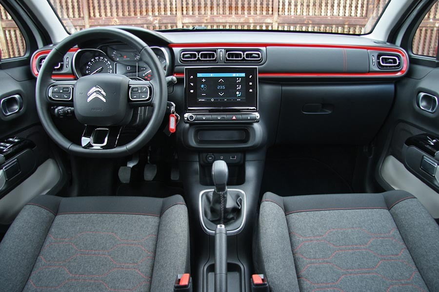 Στον θάλαμο των επιβατών του νέου C3, η σχεδιαστική φιλοσοφία παραμένει ίδια με αυτή του αμαξώματος, ενώ και εδώ οι ομοιότητες με το C4 Cactus είναι εμφανείς. Σχεδιαστικά, οι ευθείες γραμμές σε συνδυασμό με τις επίπεδες επιφάνειες και τις απαλές καμπύλες δημιουργούν για μοντέρνα και μινιμάλ εικόνα. Στην κεντρική κονσόλα ξεχωρίζει η οθόνης αφής (δεν περιλαμβάνεται στη βασική έκδοση), στην οποία συγκεντρώνονται όλες οι λειτουργίες του αυτοκινήτου, από ηχοσύστημα και κλιματισμό μέχρι επικοινωνία, ενώ ευανάγνωστος και πλήρης ενδείξεων είναι ο λιτός αισθητικά πίνακας οργάνων. Ο οδηγός κάθεται αναπαυτικά και θα βρει την κατάλληλη θέση οδήγησης μέσω των πολλαπλών ρυθμίσεων του τιμονιού και καθίσματος. Σε επίπεδο υλικών και φινιρίσματος, το εσωτερικό του νέου C3 πείθει, παρόλο που απουσιάζουν τα μαλακά πλαστικά. Στον τομέα των χώρων, το νέο Citroen C3 προσφέρει μεγάλο ωφέλιμο ύψος για το κεφάλι των επιβατών, άφθονο χώρο για τα γόνατα του συνοδηγού, αλλά και αρκετό αέρα για τα γόνατα των πίσω και τους ώμους τους. Ο σχεδιασμός μάλιστα του πίσω καθίσματος, που είναι αρκετά επίπεδο, κάνει πιο εύκολη τη φιλοξενία τρίτου επιβάτη. Όσον αφορά τις αποσκευές ο χώρος των 300 λίτρων είναι τετραγωνισμένος και πλήρως εκμεταλλεύσιμος.