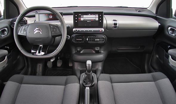 Το Citroen C4 Cactus διαθέτει μοναδικό σχεδιασμό και στο εσωτερικό, όπου όμως εντοπίζονται κάποιες μικροατέλειες που δεν συμβαδίζουν με τον high-tech χαρακτήρα του. Πρώτο συν τα πλατιά, μεγάλα και άνετα εμπρός καθίσματα που θυμίζουν πολυθρόνα. Κατόπιν το βλέμμα πέφτει πάνω στον πίνακα οργάνων, στη θέση του οποίου υπάρχει μια ψηφιακή οθόνη. Όμως απουσιάζει το στροφόμετρο και ο δείκτης θερμοκρασίας νερού του κινητήρα. Ξεχωριστό σχεδιασμό διαθέτει και το τετραγωνισμένο τιμόνι, ωστόσο δε διαθέτει τηλεσκοπική ρύθμιση. Στην απέριττη κεντρική κονσόλα κυριαρχεί η μεγάλη διαδραστική ψηφιακή οθόνη αφής 7 ιντσών. Μέσω αυτής γίνεται ο έλεγχος του κλιματισμού (δεν υπάρχουν τα κλασικά χειριστήρια), συν όλων των λειτουργιών που περιλαμβάνει ένα σύστημα infotainment τύπου tablet και ελέγχονται μέσω 6 βασικών εικονιδίων. Θήκες για μικρά η μεγαλύτερα αντικείμενα υπάρχουν πολλές και μεγάλες για όλους τους επιβάτες, αν και σε ποτηροθήκες μειονεκτεί. Επίσης μπροστά από τον συνοδηγό υπάρχει ένα μεγάλο ντουλαπάκι στην θέση του αερόσακου, ο οποίος έχει τοποθετηθεί στην οροφή (Airbag in Roof).