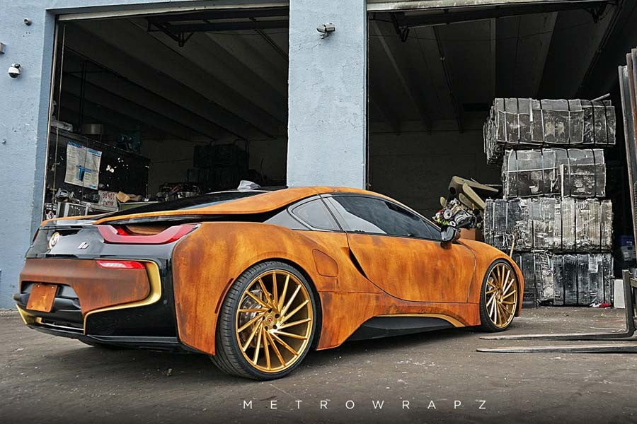 Το εικονιζόμενο «σκουριασμένο» BMW i8 το οποίο ανήκει στο μόλις 20 ετών αμερικάνο τραγουδιστή Austin Mahone, ανέλαβε η εταιρεία MetroWrapz για να το μεταμορφώσει στην κυριολεξία και να το κάνει αγνώριστο. Σίγουρα πολλοί θα είναι εκείνοι που θα αντικρύσουν την σπορ BMW γεμάτοι περιέργεια και θα θελήσουν να την πιάσουν για να διαπιστώσουν αν είναι όντως σκουριασμένη ή όχι. Κάθε πάνελ του αμαξώματος (εκτός ελαχίστων σημείων) έχει ντυθεί με μεμβράνη, ενώ συνδυάζεται με χρυσαφί ζάντες και ίδιας απόχρωσης περίγραμμα στη μάσκα, προφυλακτήρες και το «δακτυλίδι» στα σήματα της BMW.