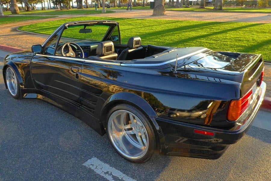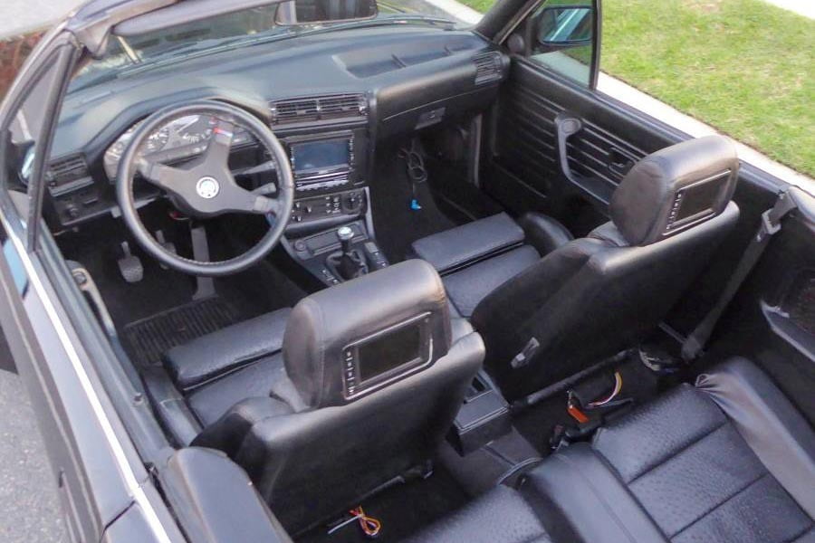 Από πού να πιάσει κανείς και να ξεκινήσει για τις μετατροπές που έχουν γίνει σε αυτή την αρχική BMW 325i Cabrio του 1989 με τα σχεδόν 129.000 χιλιόμετρα. Εξωτερικά εφοδιάζεται με σπόιλερ, μεγάλες ζάντες, αεραγωγούς στα πίσω φτερά, πόρτες τύπου «Lamborghini», κ.λπ. Στο εσωτερικό με το δερμάτινο σαλόνι τα βλέμματα πέφτουν στις οθόνες LCD που υπάρχουν στην κεντρική κονσόλα και πίσω από τα προσκέφαλα των εμπρός καθισμάτων.