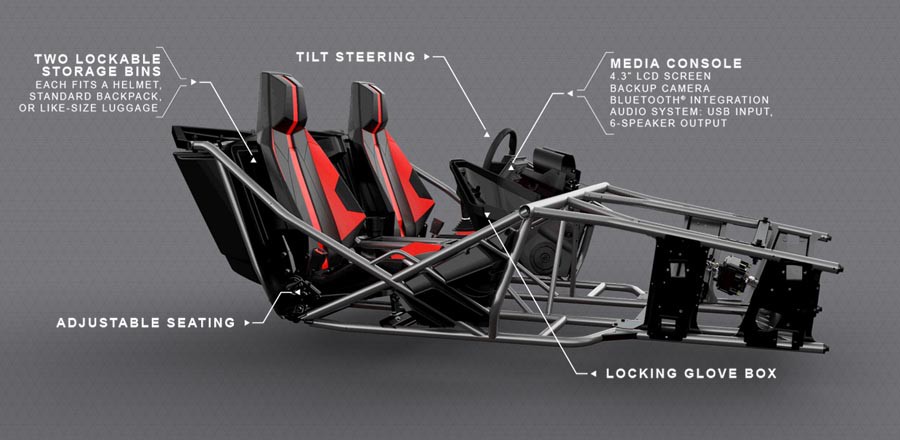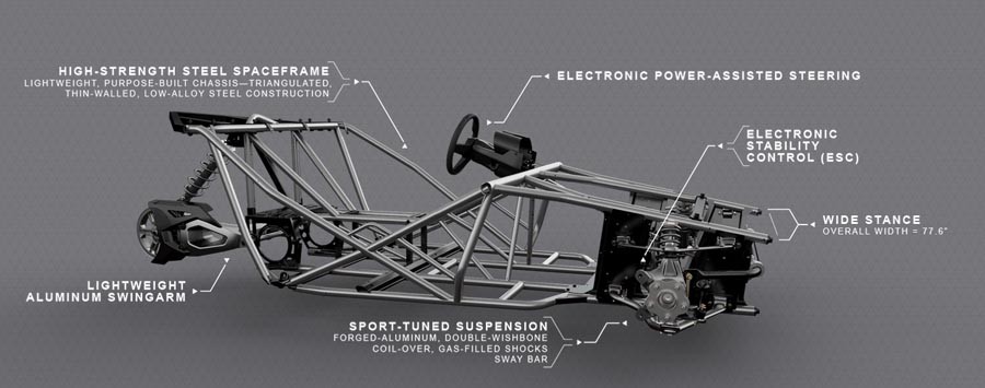 Το διαστάσεων ΜxΠxΥ: 3.800×1.960×1.318 χλστ., με μεταξόνιο 2.667 χλστ. και απόσταση από το έδαφος μόλις 12,7 εκ. Polaris Slingshot διαθέτει πάνελ από πολυμερές υλικό, σωληνωτό ατσάλινο πλαίσιο και πατάει σε ζάντες 18 ιντσών εμπρός με ελαστικά 225/45, ενώ πίσω ο τροχός είναι 20 ιντσών με ελαστικό 255/35. Επίσης, εφοδιάζεται με αεριζόμενους δίσκους εμπρός – πίσω διαμέτρου 298 χλστ., με μεταβλητή ηλεκτρική υποβοήθηση στο τιμόνι, καθώς και με ABS, ESP και Traction Control