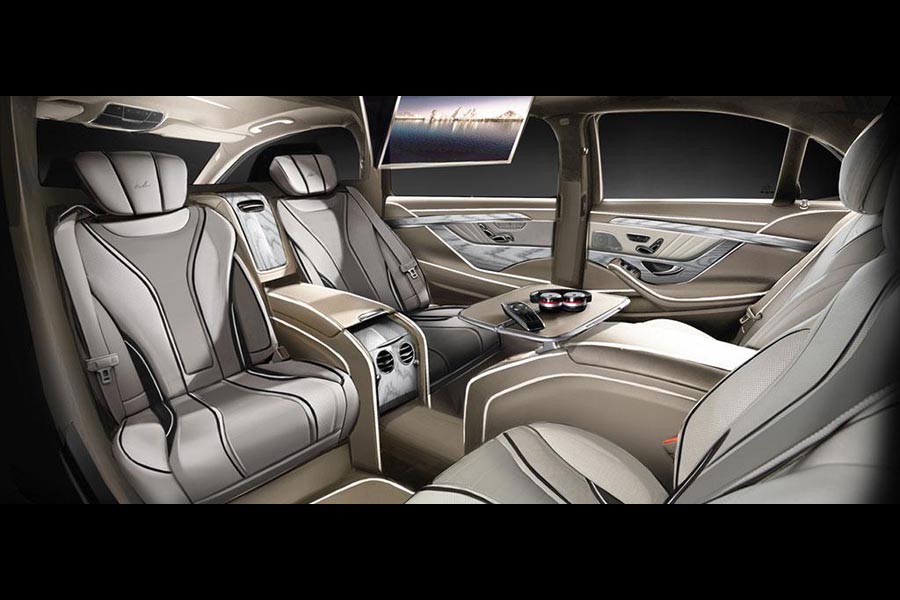 Εξωτερικά, εκτός από το μακρύτερο μεταξόνιο, η MercedesS-Class XXL διαθέτει νέα μάσκα και προφυλακτήρες, ζάντες 21 ιντσών, πιο παχιά πλευρικά παράθυρα 6 χλστ. και body kit από ανθρακόνημα. Μεγάλες αλλαγές υπάρχουν και στο εσωτερικό με τις αντικριστά τοποθετημένες θέσεις, τις οθόνες, τα ηλεκτρικά κουρτινάκια, τις επενδύσεις από δέρμα Nappa κλπ.