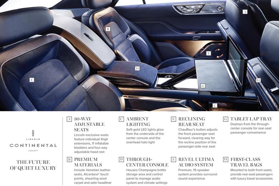 Λίγες μέρες πριν την έναρξη της Διεθνούς Έκθεσης Αυτοκινήτου της Νέας Υόρκης, η Lincoln (να υπενθυμίσουμε ότι ανήκει στον όμιλο Ford), παρουσιάζει το νέο πολυτελές πρωτότυπο μοντέλο της Continental. Το πληθωρικών διαστάσεων αμάξωμά της με την κομψή αλλά και επιβλητική ταυτόχρονα εικόνα διαθέτει αρκετά ξεχωριστά γνωρίσματα. Μερικά από αυτά είναι η εμπρός ευμεγέθης νίκελ μάσκα με τις κυψέλες σχήματος αντίστοιχου με το σήμα της εταιρείας, όπως συμβαίνει και με τους 5 Laser προβολείς που ενσωματώνονται σε κάθε φωτιστικό σώμα. Στο πλάι κυριαρχούν τα νεύρα, οι χειρολαβές αφής και οι μεγάλες ζάντες των 21 ιντσών, ενώ πίσω τα μακρόστενα φώτα και οι τονισμένοι ώμοι θυμίζουν κάτι μεταξύ… Jaguar και Volvo, που ανήκαν παλαιότερα στον όμιλο Ford.