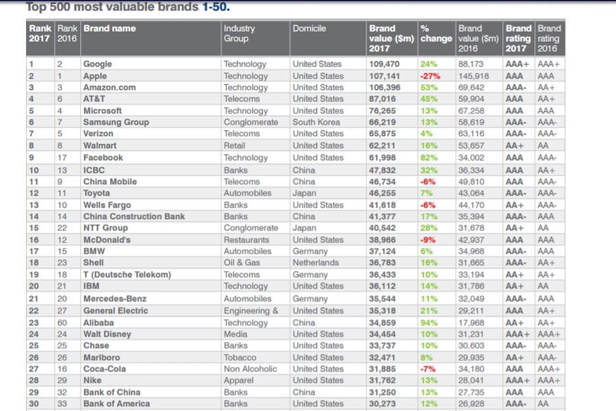 Όσον αφορά την γενική κατάταξη, η Toyota έχασε μία θέση σε σχέση με πέρυσι, ούσα πλέον στην 12η θέση, μία θέση έχασε και η Mercedes-Benz ενώ δύο θέσεις έχασε η BMW. Για την ιστορία να αναφέρουμε πως πρώτη εταιρεία στον κόσμο, σύμφωνα πάντα με την μελέτη της BrandFinance είναι η Google, εκτοπίζοντας από την πρώτη θέση την Apple, η οποία είναι πλέον δεύτερη με αξία 109.470 δισ. δολάρια και 107.141 δισ. δολάρια αντίστοιχα.