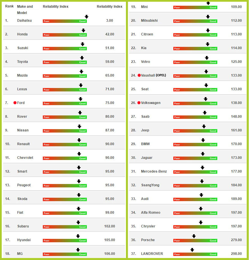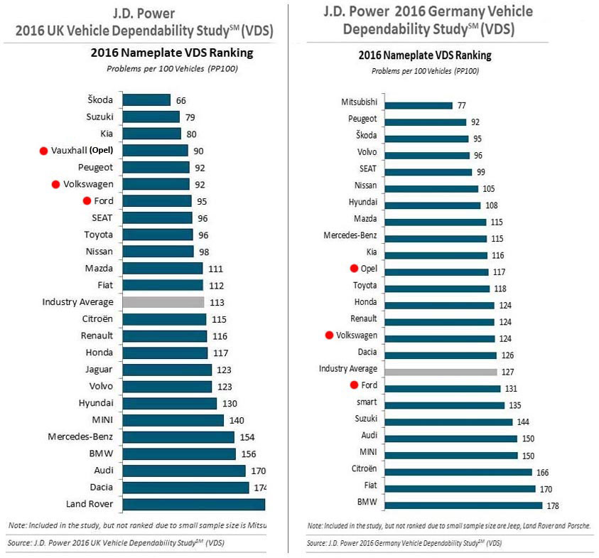 Μια εικόνα για τα μοντέλα και τις μάρκες μπορούμε να έχουμε μέσω μεγάλων ερευνών που γίνονται στην Ευρώπη και ειδικότερα για τις μεγάλες αγορές της Αγγλίας και της Γερμανίας. Σύμφωνα με την έρευνα της Reliability Index από τη Μ. Βρετανία, η οποία συνεχώς ανανεώνει τα δεδομένα της και περιλαμβάνει και πιο παλιά μοντέλα, η Ford τοποθετείται στην 7η θέση της συνολικής κατάταξης, η Opel στην 24η θέση και η VW στην 26η θέση.