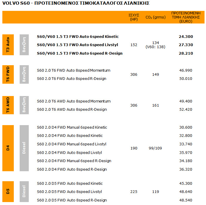 Η Volvo προσφέρει τα μεσαία μοντέλα της S60 και V60 σε τιμές που ξεκινούν από 24.300 ευρώ στην έκδοση T3 Kinetic με τον βενζινοκινητήρα των 1.5 λτ. και το στάνταρ αυτόματο κιβώτιο ταχυτήτων έξι σχέσεων (βλ. παρακάτω αναλυτικό τιμοκατάλογο).