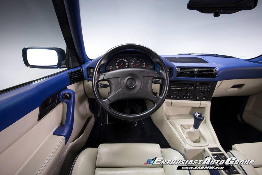 Στοιχεία που ισχύουν και για την εικονιζόμενη BMW M5 Touring, η οποία έχει κάτι που την κάνει εξαιρετικά σπάνια. Σύμφωνα με την αγγελία, πρόκειται για μία από τις μόλις δύο M5 Touring E34 που βγήκαν από τη γραμμή παραγωγής σε χρώμα Santorin Blue. Αυτή η M5 Touring κατασκευάστηκε στις 9 Δεκεμβρίου 1994 και έκτοτε έχει διανύσει 154.828 χιλιόμετρα, ενώ όπως φαίνεται από τις φωτογραφίες και το δίχρωμο δερμάτινο εσωτερικό της βρίσκεται σε πάρα πολύ καλή κατάσταση.