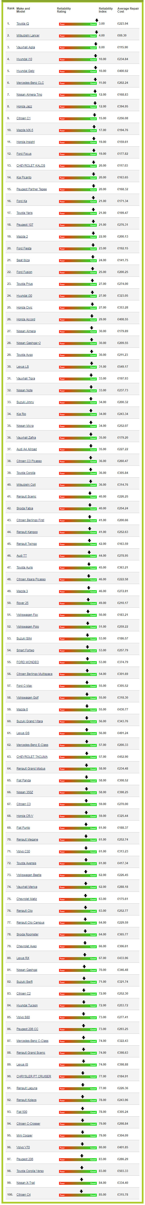 Στην σχετική έρευνα, όσο μικρότερος είναι ο δείκτης Reability Index, τόσο πιο αξιόπιστο είναι το αυτοκίνητο, ενώ για κάθε μοντέλο αναφέρεται και ο μέσος όρος του κόστους επισκευών σε στερλίνες. Δείτε παρακάτω τα 100 πιο αξιόπιστα αυτοκίνητα που κυκλοφορούν τους 12 τελευταίους μήνες στους δρόμους της Αγγλίας: