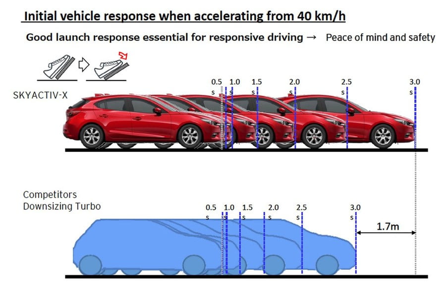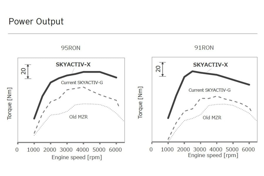 Η Mazda με τους νέους turbo κινητήρες βενζίνης τεχνολογίας SkyActiv-X υπόσχεται αύξηση της ροπής από 10% έως 30% σε σχέση με τους SkyActiv-G, καθώς και μείωση της κατανάλωσης από 35% έως 45% σε σχέση με τους αντίστοιχους κινητήρες σε χωρητικότητα του 2008. Προς το παρόν η Mazda δεν ανακοίνωσε σε ποιο μοντέλο θα τοποθετήσει για πρώτη φορά κινητήρα SkyActiv-X, όμως στην παραγωγή θα μπει το 2019.