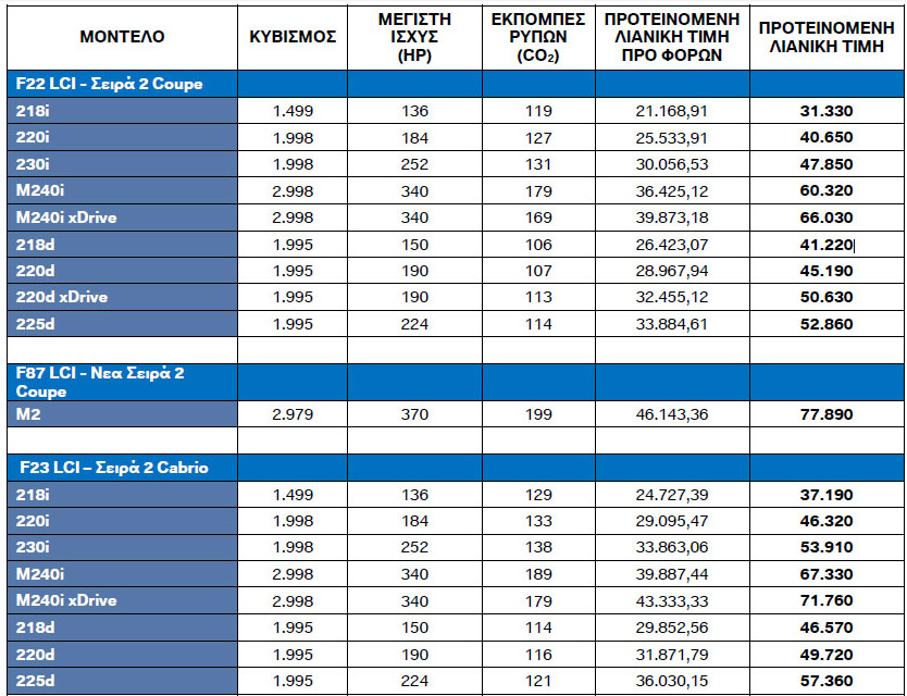 Δείτε παρακάτω τον αναλυτικό τιμοκατάλογο της ανανεωμένης BMW Σειρά 2 Coupe, Cabrio και Μ2: